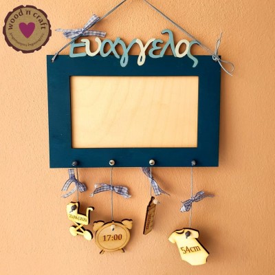 Ξύλινη παιδική χειροποίητη κορνίζα με όνομα και κρεμαστά με τα στοιχεία γέννησης του παιδιού ή με χαραγμένες ευχές όπως αγάπη, όνειρα, χαμόγελα κλπ. Βαμμένη στα χρώματα της επιλογής σας.