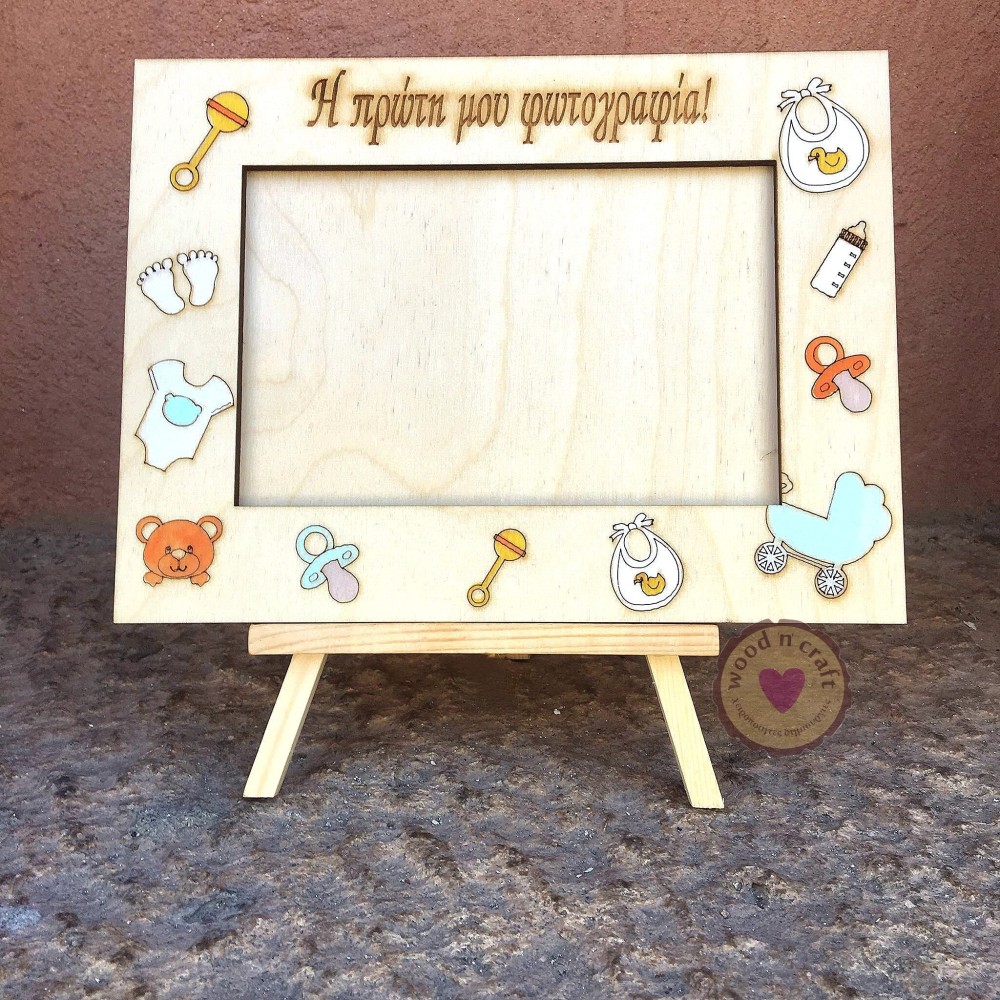 Ξύλινη παιδική χειροποίητη κορνίζα με χάραξη στηριζόμενη σε ξύλινο καβαλέτο. Ένα από τα πιο σημαντικά στιγμιότυπα έχει την δική του μοναδική θέση στη διακόσμηση του παιδικού δωματίου!