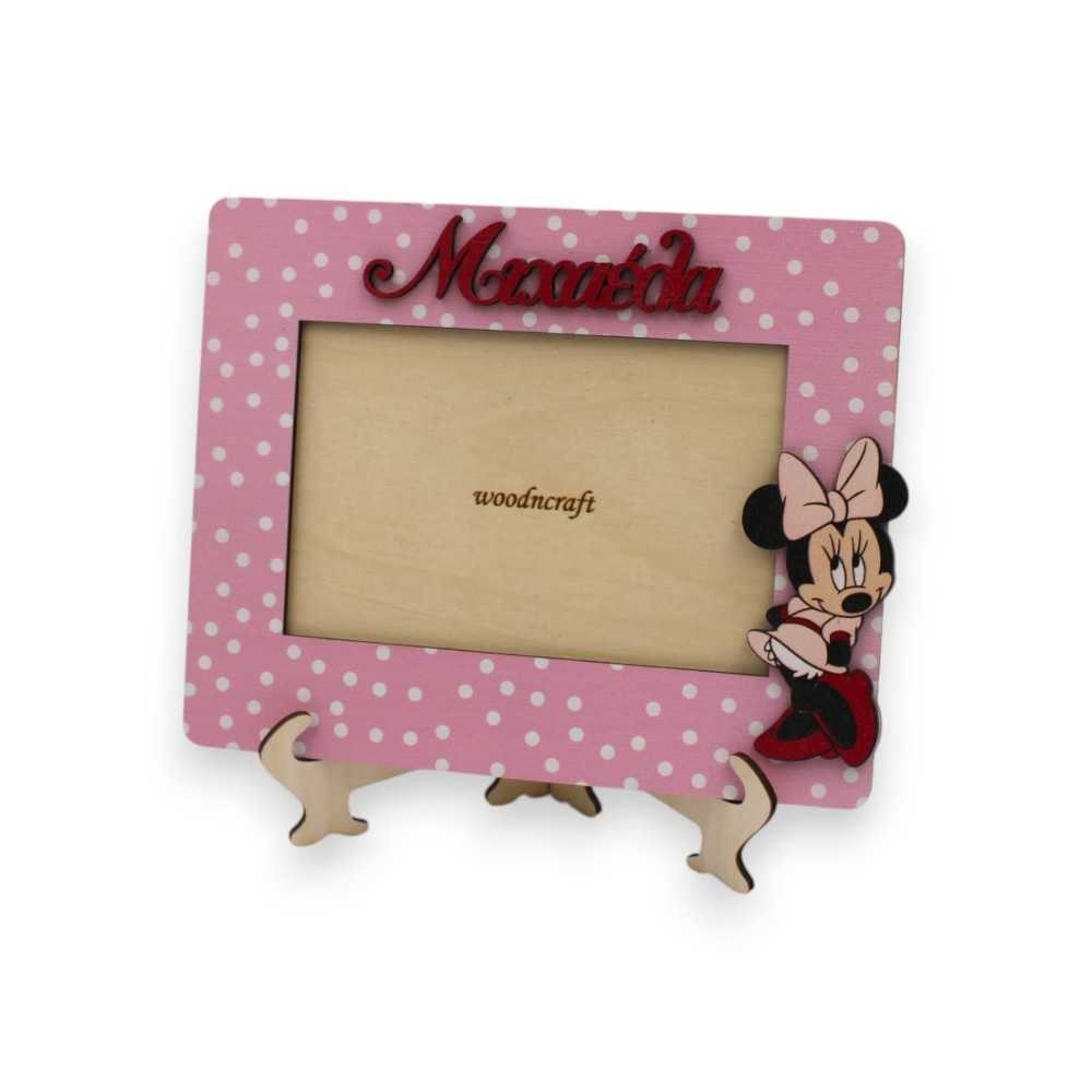 Ξύλινη χειροποίητη παιδική κορνίζα με όνομα και την αγαπημένη Μίνι Μάους! Βάφεται σε χρώματα που ταιριάζουν με το παιδικό δωμάτιο.