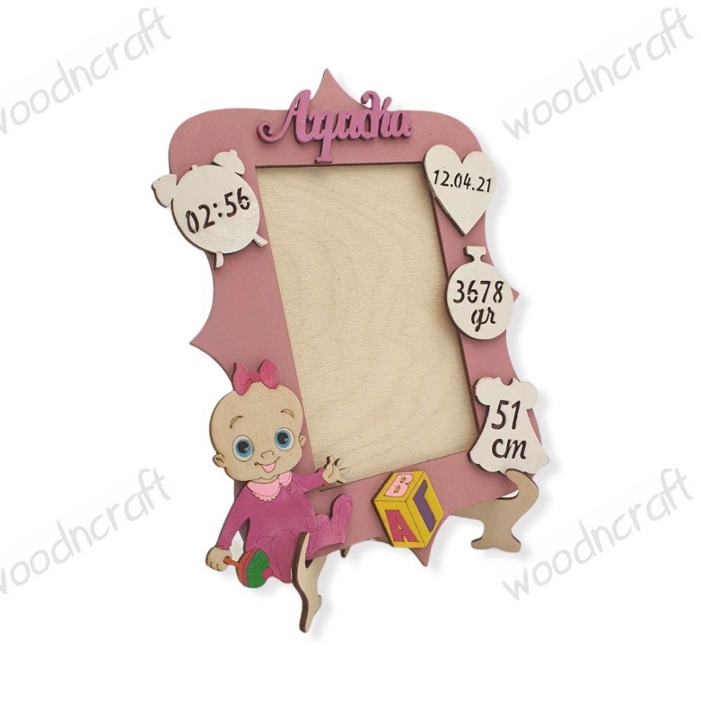 Μοναδική ξύλινη επιτραπέζια κορνίζα με ένα χαριτωμένο, παιχνιδιάρικο μωρό κοριτσάκι, το όνομα της επιλογής σας και φυσικά τα στοιχεία γέννησης του παιδιού! Βάφεται στα χρώματα της επιλογής σας.