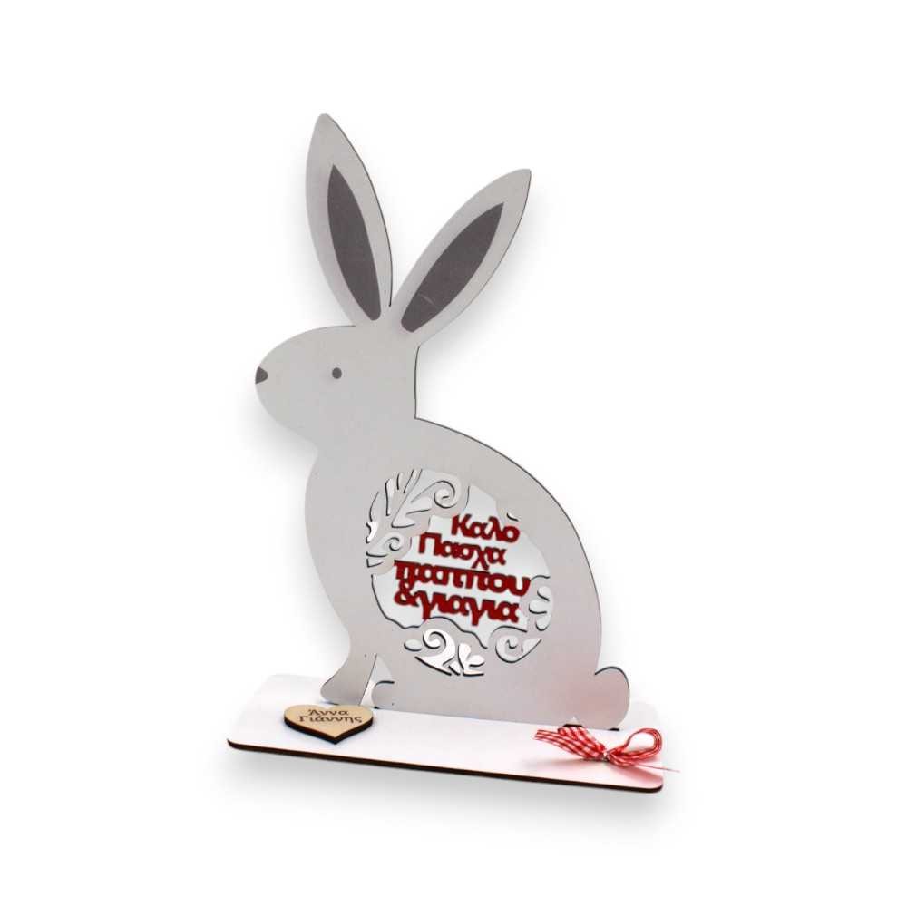 Ξύλινο επιτραπέζιο διακοσμητικό κουνέλι με ενσωματωμένη πασχαλινή αφιέρωση για τα αγαπημένα σας πρόσωπα. Βαμμένο σε χρώματα της επιλογής σας και διακοσμημένο με φιογκάκι! Στην βάση μπορεί να μπει μια καρδούλα με το όνομα της επιλογής σας.