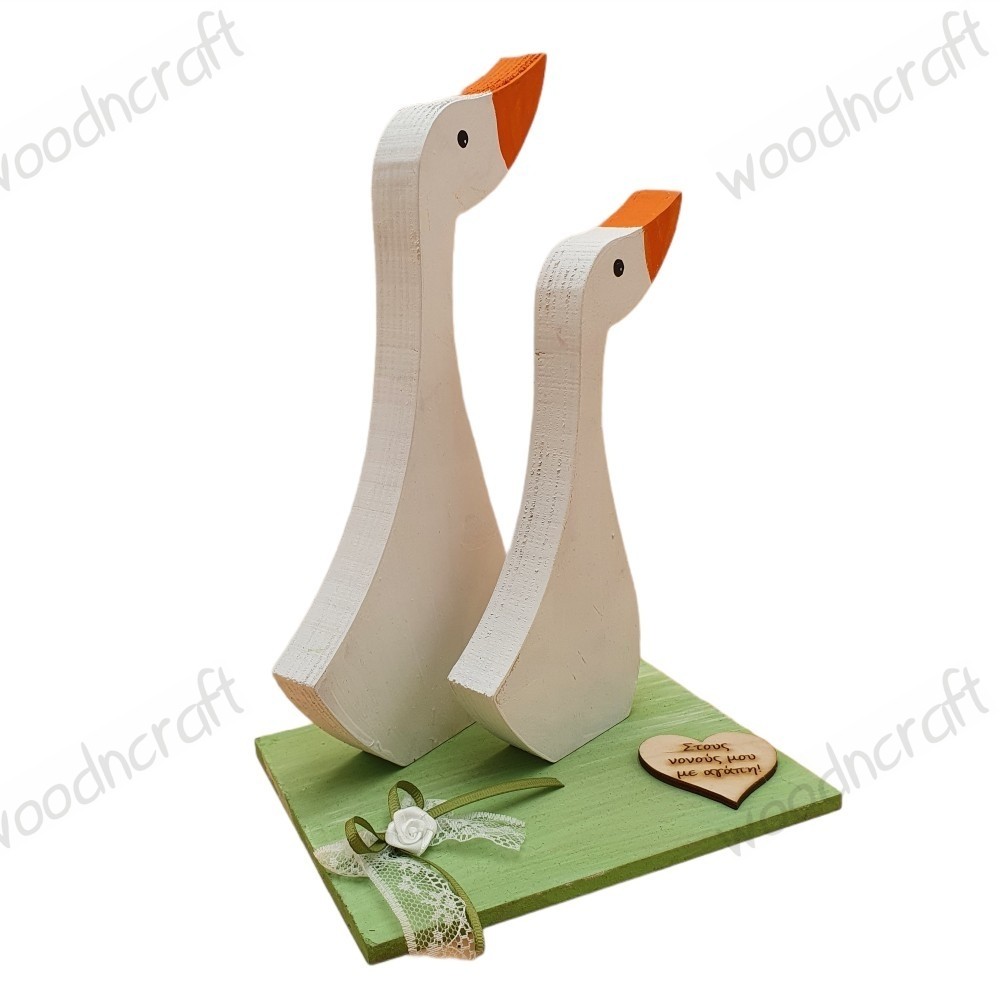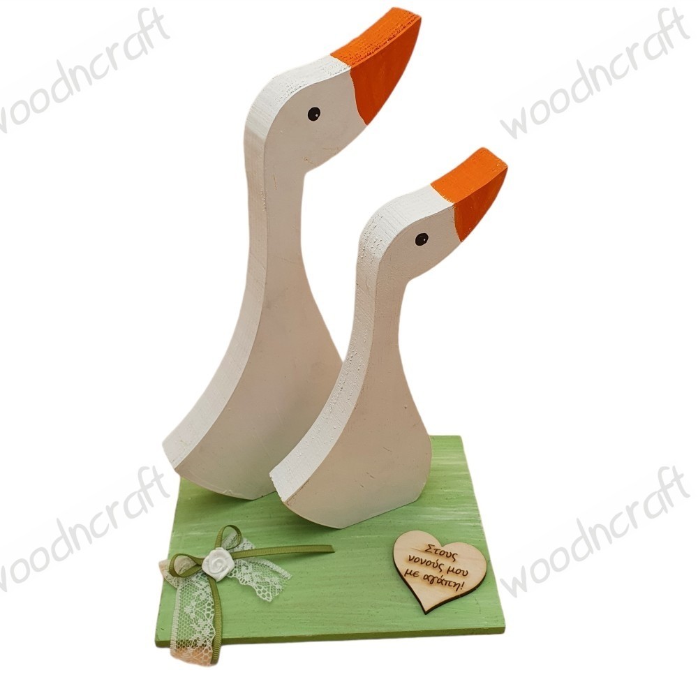 Ξύλινο επιτραπέζιο διακοσμητικό με ένα ζευγάρι όμορφες, καμαρωτές πάπιες φτιαγμένες από χοντρό ξύλο, βαμμένες στο χέρι και τοποθετημένες σε ξύλινη βάση με φιογκάκι και καρδούλα με την αφιέρωση της επιλογής σας!