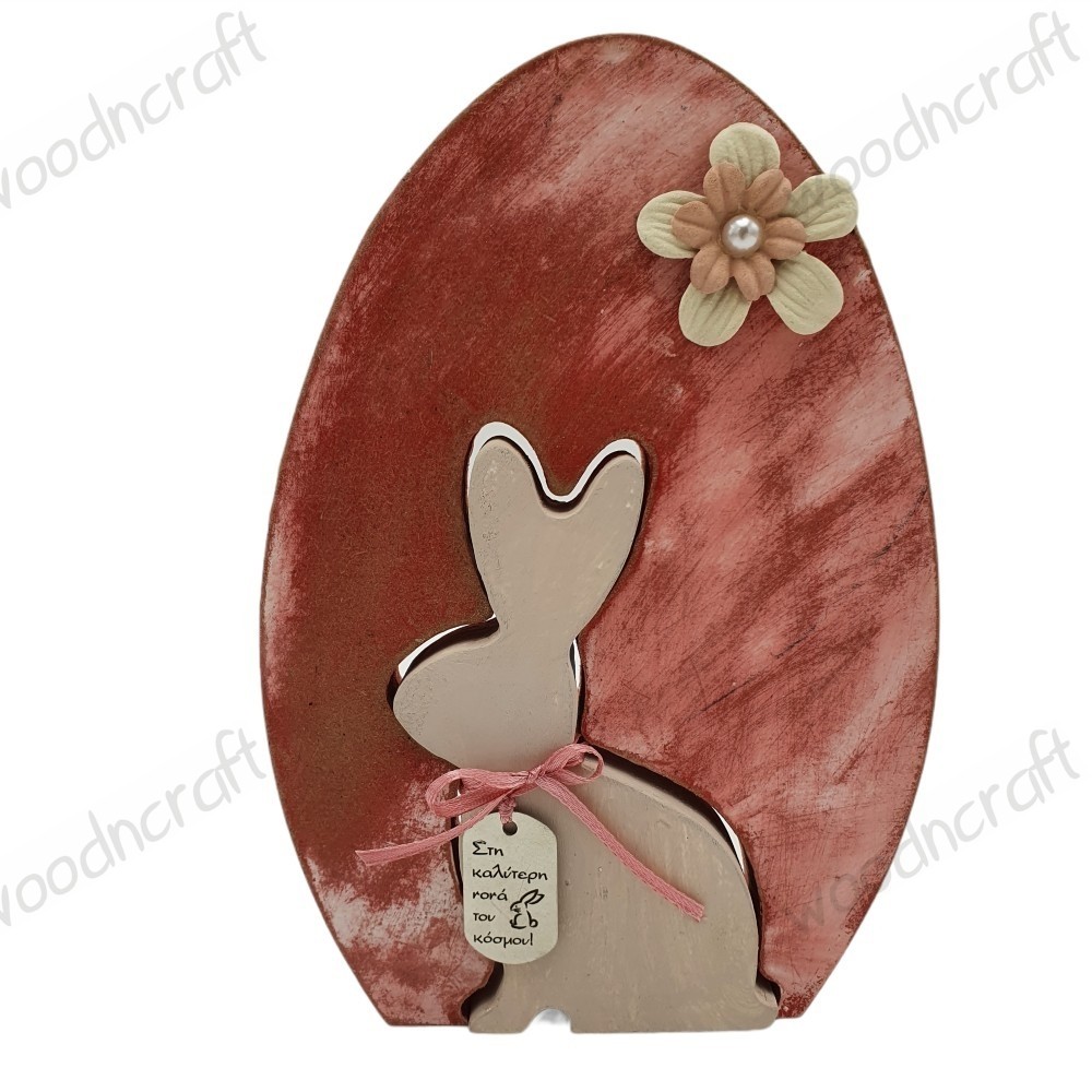 Ξύλινο χειροποίητο επιτραπέζιο διακοσμητικό αυγό με αποσπώμενο λαγουδάκι στολισμένο με φιογκάκι και κρεμαστή μεταλλική πλακέτα χαραγμένη με αφιέρωση για τα αγαπημένα σας πρόσωπα! Βαμμένο στο χέρι σε χρώματα της επιλογής σας και διακοσμημένο με λουλουδάκι!