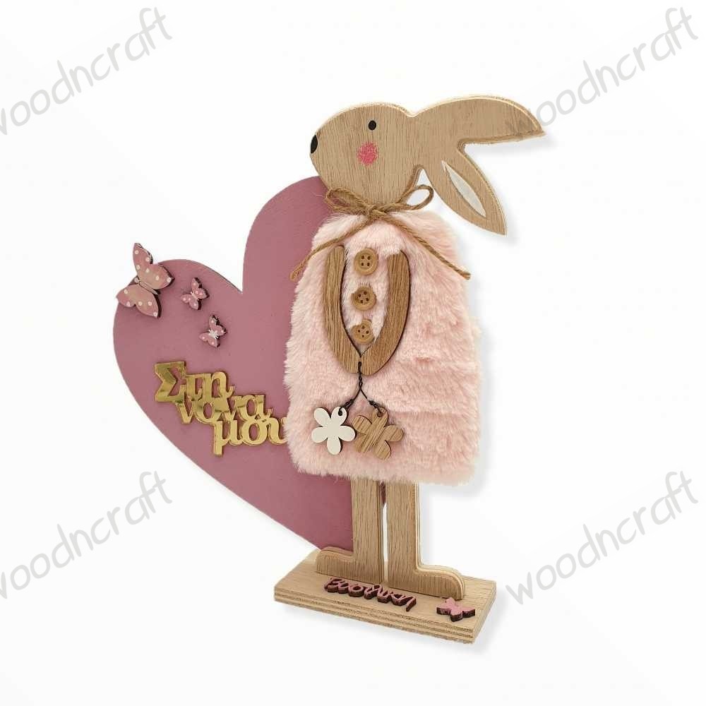 Επιτραπέζιο χειροποίητο διακοσμητικό καρδιά διακοσμημένο με ένα ξύλινο λαγουδάκι ντυμένο με ροζ γούνα. Όμορφες πεταλούδες και κοπτική αφιέρωση από χρυσό καθρέφτη πλεξιγκλάς πάνω στην καρδιά και στη βάση προαιρετικά το όνομα της επιλογής σας!