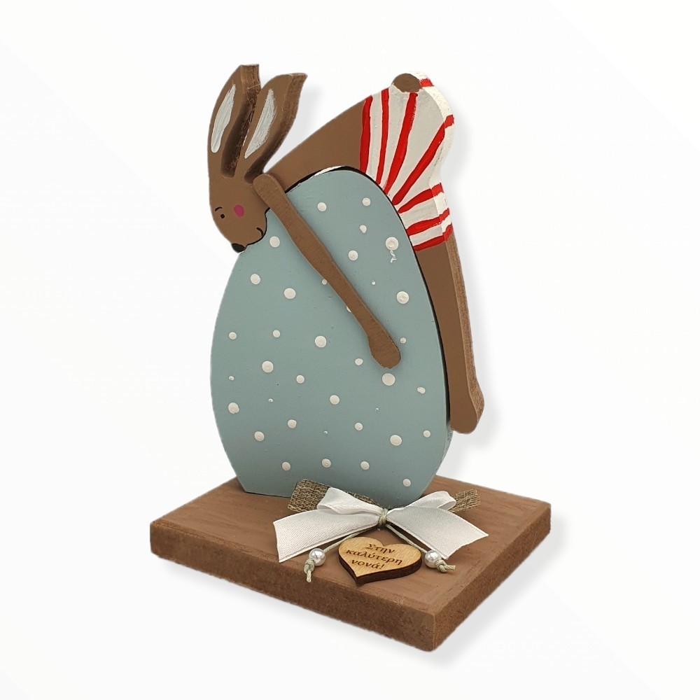 Ξύλινο χειροποίητο διακοσμητικό με ένα λαγουδάκι που αγκαλιάζει και ξαπλώνει πάνω στο δικό του πασχαλινό αυγό! Βαμμένο στο χέρι, στηριζόμενο σε ξύλινη βάση και διακοσμημένο με κορδελάκια, πέρλες και μια καρδιά χαραγμένη με αφιέρωση για τα αγαπημένα σας πρόσωπα!