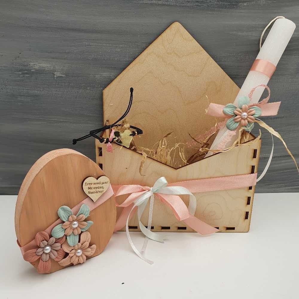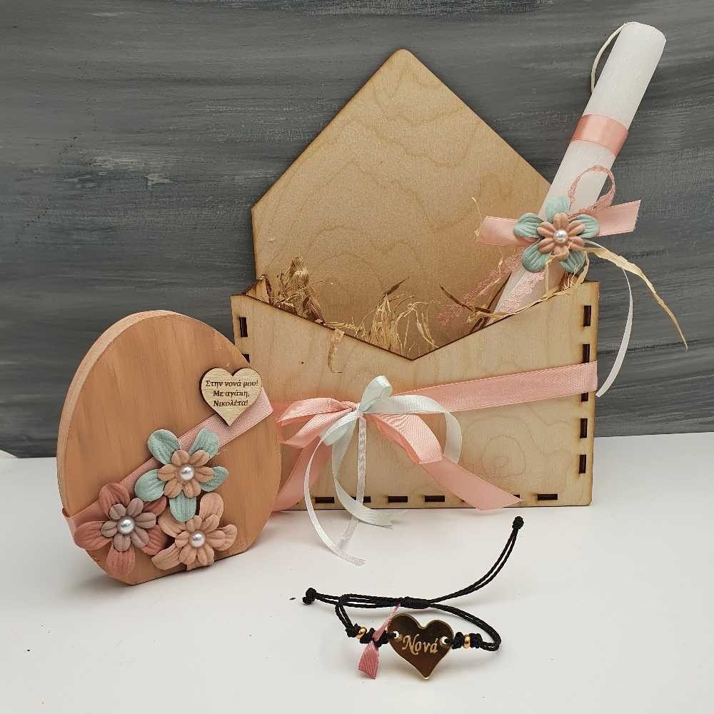 Πρωτότυπη χειροποίητη πασχαλινή σύνθεση σε ξύλινη θήκη - φάκελο, για να χαρίσετε στα αγαπημένα σας πρόσωπα! Η σύνθεση περιλαμβάνει κυλινδρική ρομαντική λαμπάδα με χειροποίητα λουλουδάκια, ξύλινο αυτοστηριζόμενο αυγό με την αφιέρωση της επιλογής σας και βραχιολάκι με καρδούλα από χρυσό καθρέφτη πλεξιγκλάς χαραγμένη με τη λέξη νονά, γιαγιά, μαμά ή το όνομα της επιλογής σας!