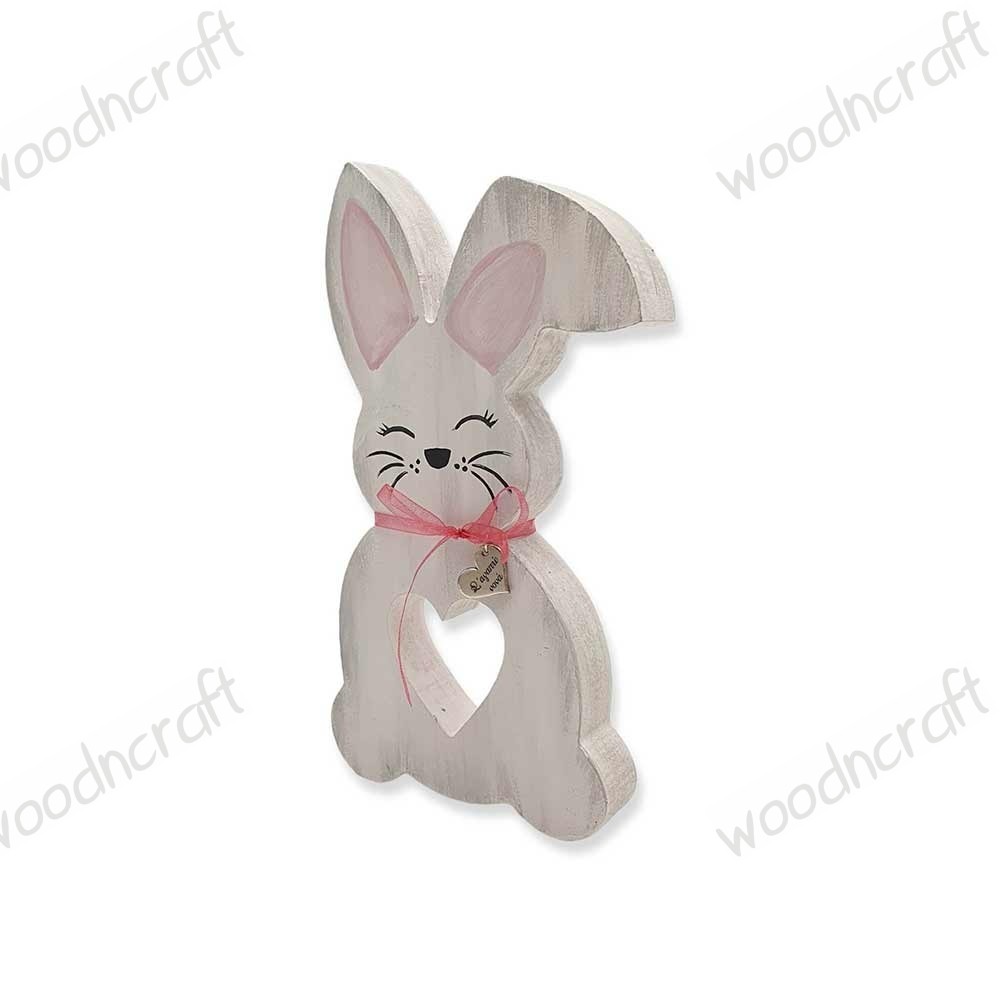 Ξύλινο αυτοστηριζόμενο διακοσμητικό κουνέλι με κενό στην κοιλίτσα του σε σχήμα καρδιάς. Βαμμένο στο χέρι και διακοσμημένο με κορδελίτσα όπου κρέμεται μεταλλική καρδούλα με την αφιέρωση της επιλογής σας.