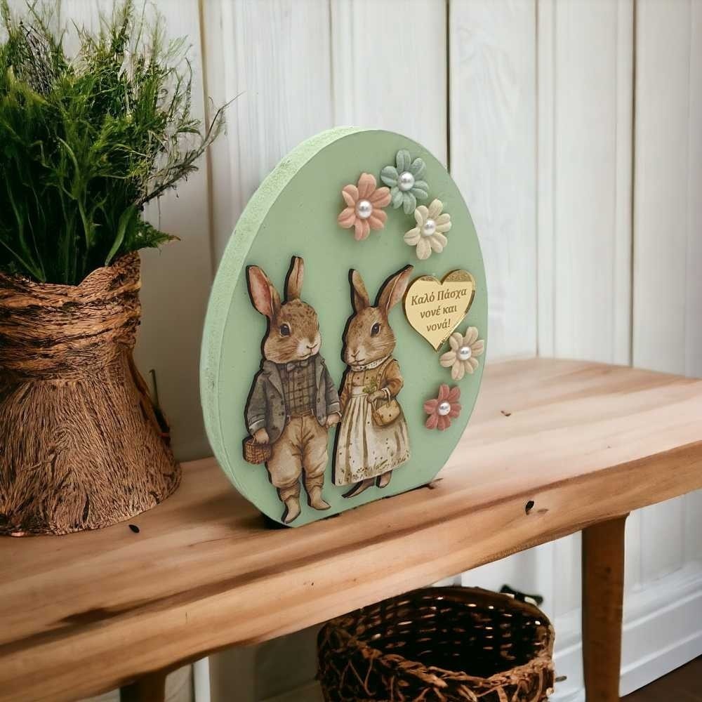 Ξύλινο διακοσμητικό αυγό με vintage αύρα! Ταξιδέψτε σε μια εποχή αθωότητας με αυτό το διακοσμητικό αυγό. Τα χαριτωμένα vintage κουνέλια, τα απαλά λουλούδια και οι γυαλιστερές πέρλες, δημιουργούν μια ατμόσφαιρα ρομαντισμού και κομψότητας! Σημαντική λεπτομέρεια η καρδούλα από χρυσό καθρέφτη plexiglass στην οποία μπορεί να χαραχτεί η προσωπική σας αφιέρωση.