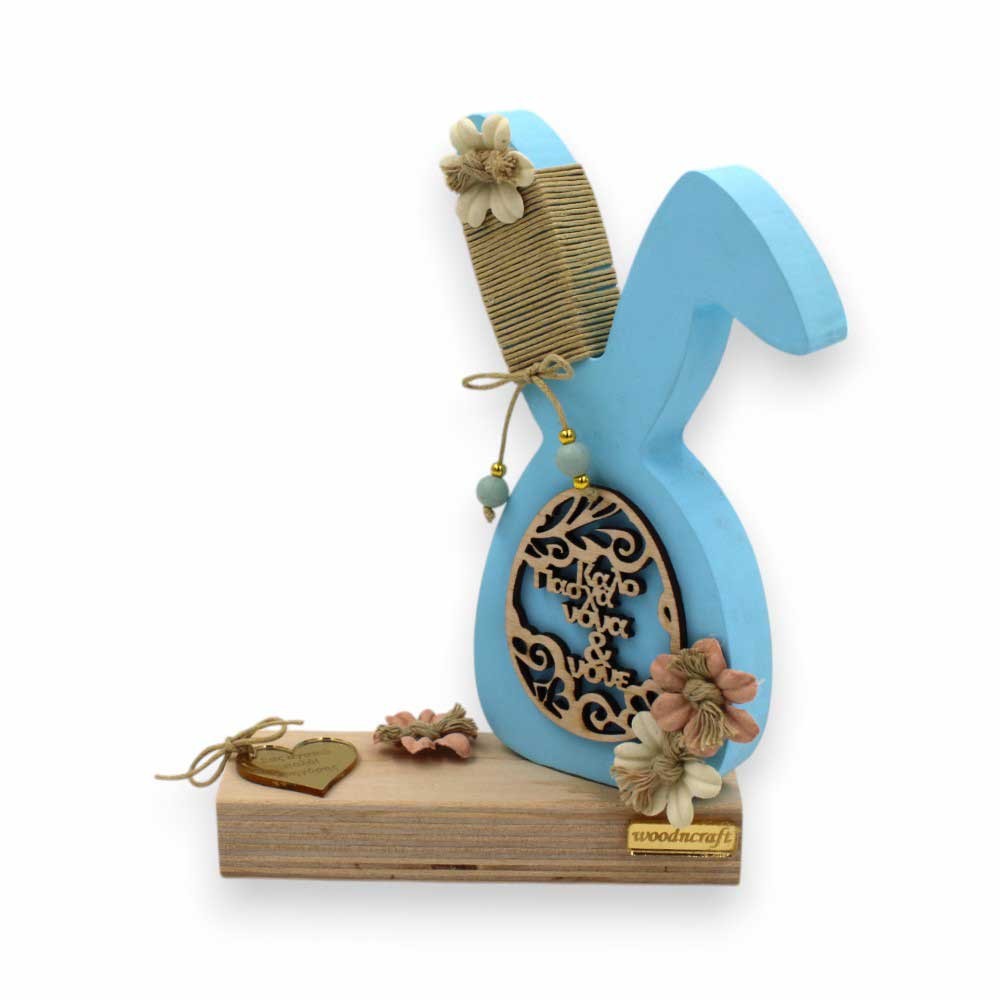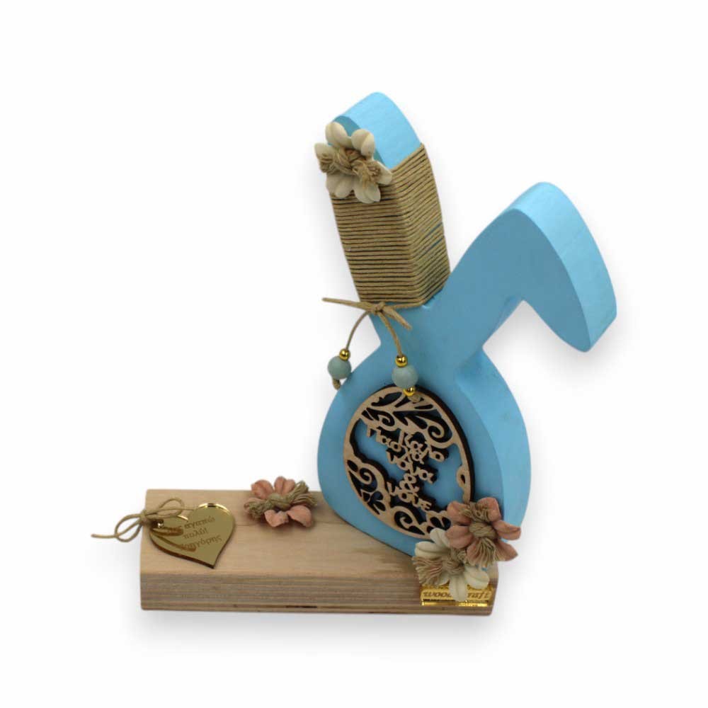 Το ξύλινο λαγουδάκι, βαμμένο στο χέρι σε γαλάζια απόχρωση, συνδυάζει την κομψότητα με τη ζεστασιά της παράδοσης.