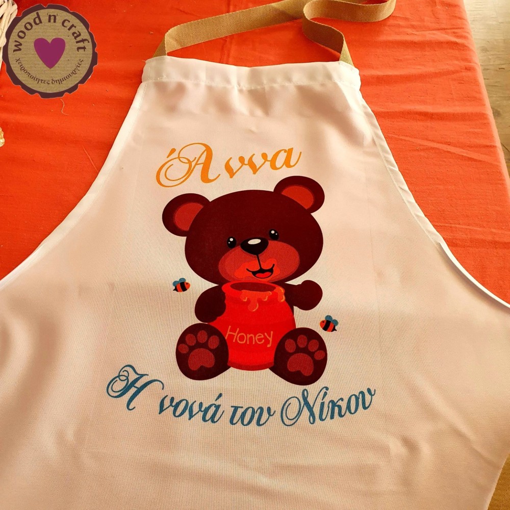 Μοναδική προσωποποιημένη ποδιά βάφτισης με ένα αρκουδάκι που τρώει μέλι! Μπορούν να μπουν ονόματα, κάποια αφιέρωση της επιλογής σας κλπ.