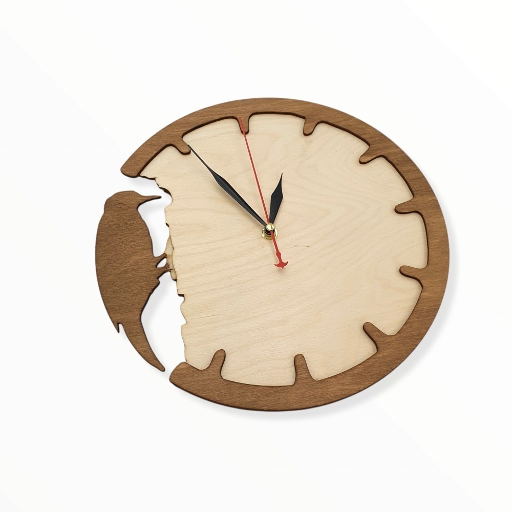 Πρωτότυπο ξύλινο χειροποίητο ρολόι τοίχου για να δώσετε μια ξεχωριστή πινελιά στο προσωπικό σας χώρο ή στην επιχείρηση σας! Προσοχή μόνο... ένα πουλάκι έχει πέσει με τα μούτρα στη δουλειά! Ένα ιδιαίτερο ρολόι βαμμένο και κομμένο εξ' ολοκλήρου σε cnc laser!