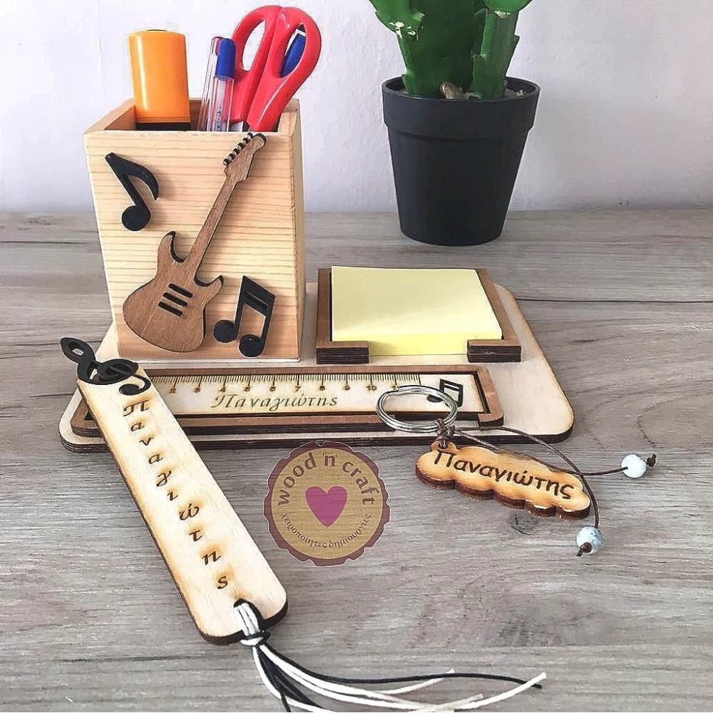 Μοναδικό χειροποίητο μαθητικό σετ γραφείου αποτελούμενο από ξύλινο χάρακα, χαρτάκια post it, σελιδοδείκτη, μπρελόκ και μολυβοθήκη με θέμα την μουσική και χάραξη ονόματος της επιλογής σας!