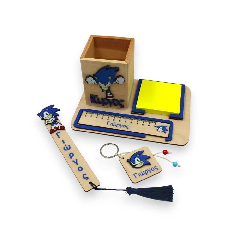 Μοναδικό χειροποίητο μαθητικό σετ γραφείου αποτελούμενο από ξύλινο χάρακα, χαρτάκια post it, σελιδοδείκτη, μπρελόκ και μολυβοθήκη με τον αγαπημένο ήρωα Σόνικ και χάραξη ονόματος της επιλογής σας!