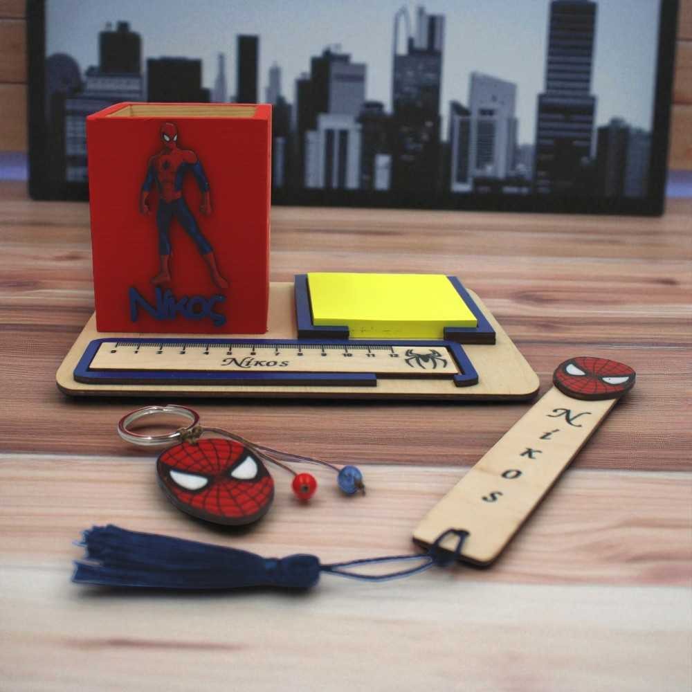 Μοναδικό χειροποίητο μαθητικό σετ γραφείου αποτελούμενο από ξύλινο χάρακα, χαρτάκια post it, σελιδοδείκτη, μπρελόκ και μολυβοθήκη με τον αγαπημένο σούπερ ήρωα Σπάιντερμαν, με δυνατότητα χάραξης του ονόματος της επιλογής σας!
