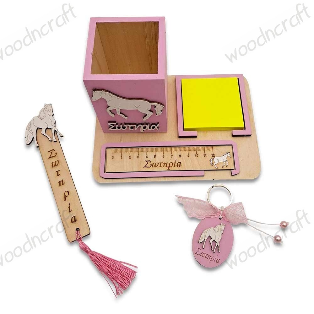 Μοναδικό χειροποίητο μαθητικό σετ γραφείου αποτελούμενο από ξύλινο χάρακα, χαρτάκια post it, σελιδοδείκτη, μπρελόκ και μολυβοθήκη με θέμα το άλογο, με δυνατότητα χάραξης του ονόματος της επιλογής σας!