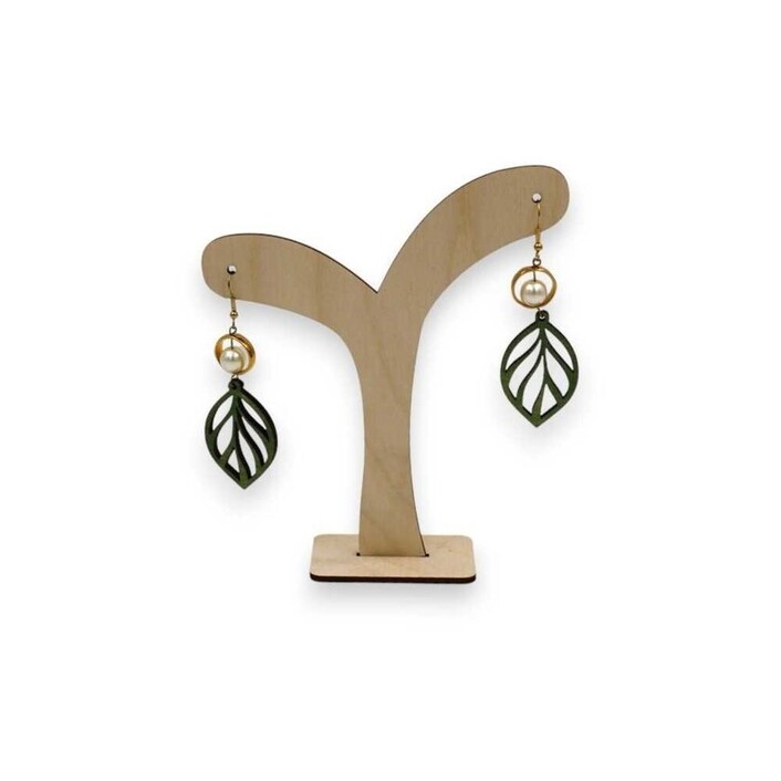 Κάθε κομμάτι συνδυάζει λεπτοκατασκευασμένα ξύλινα φυλλαράκια σε βαθύ πράσινο χρώμα, έναν κομψό χρυσό μεταλλικό κρίκο και μια λαμπερή λευκή πέρλα που προσθέτει μια διακριτική πινελιά πολυτέλειας.