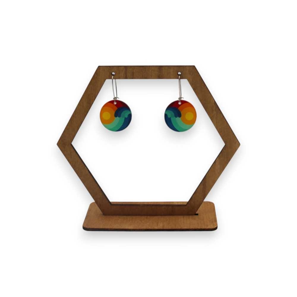 Ένα ζευγάρι σκουλαρίκια που ταξιδεύει τη φαντασία! Με κυκλικό σχήμα διαμέτρου 3 εκ., κατασκευασμένα από ανθεκτικό πλεξιγκλάς και στολισμένα με εκτύπωση UV υψηλής ευκρίνειας, αυτά τα σκουλαρίκια είναι ένας ύμνος στο καλοκαίρι και τη δημιουργική έκφραση.
