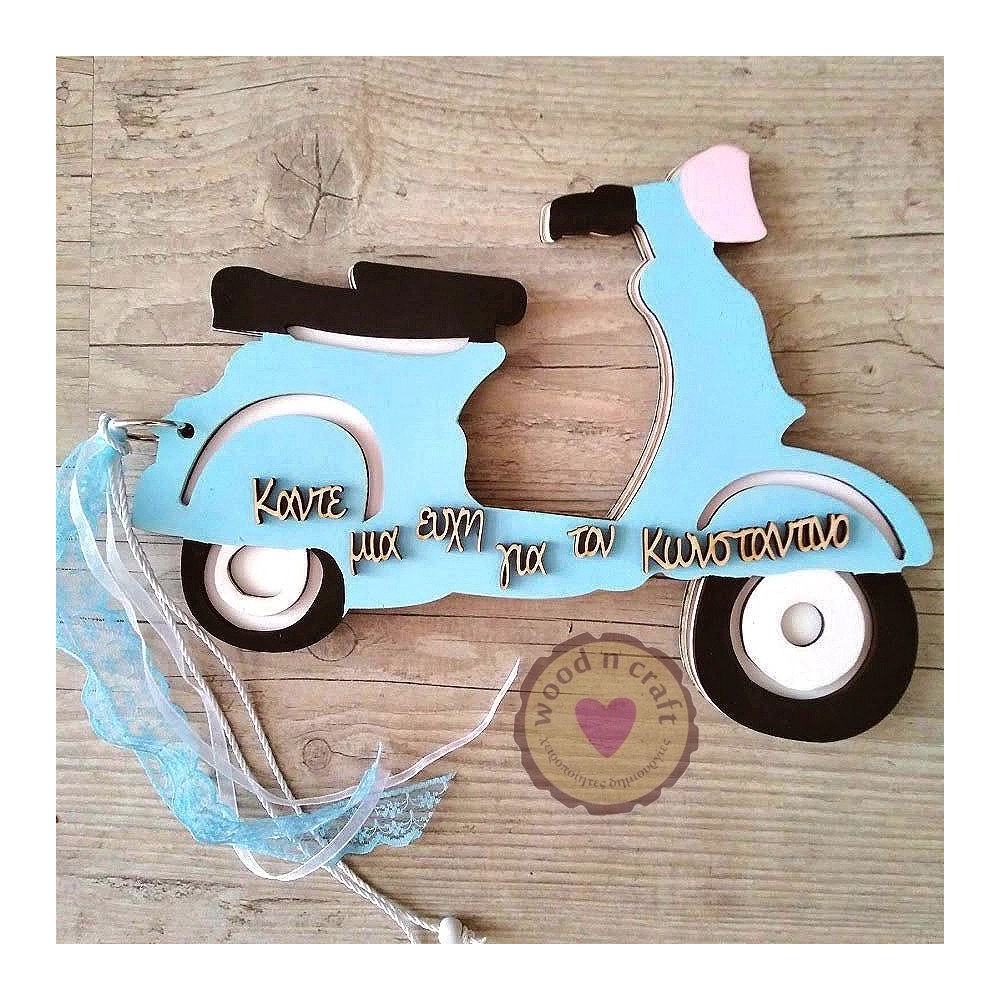Μοναδικό ξύλινο χειροποίητο βιβλίο ευχών σε σχέδιο μηχανή βέσπα στα χρώματα της δικής σας βάπτισης, διακοσμημένη με αντίστοιχα κορδελάκια!