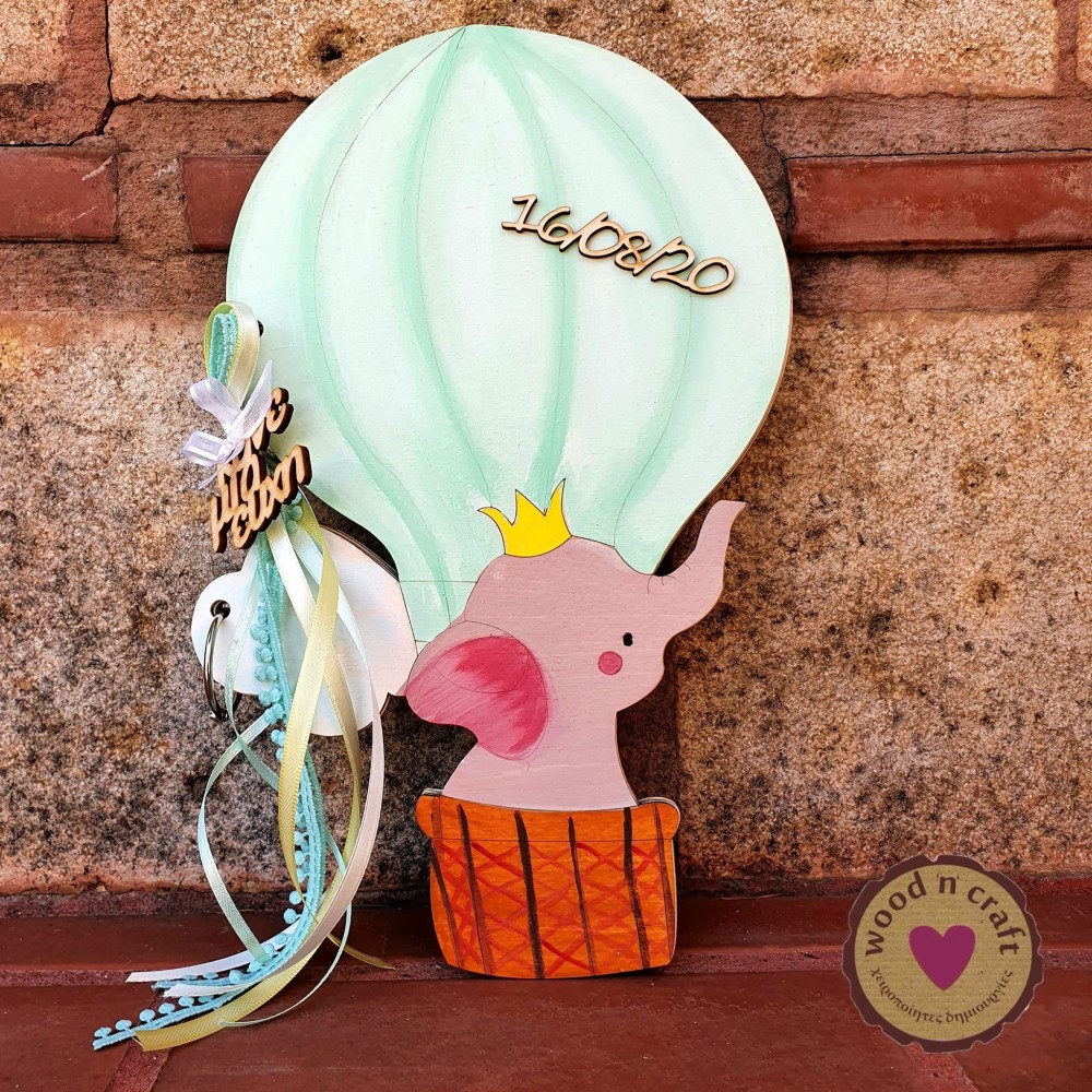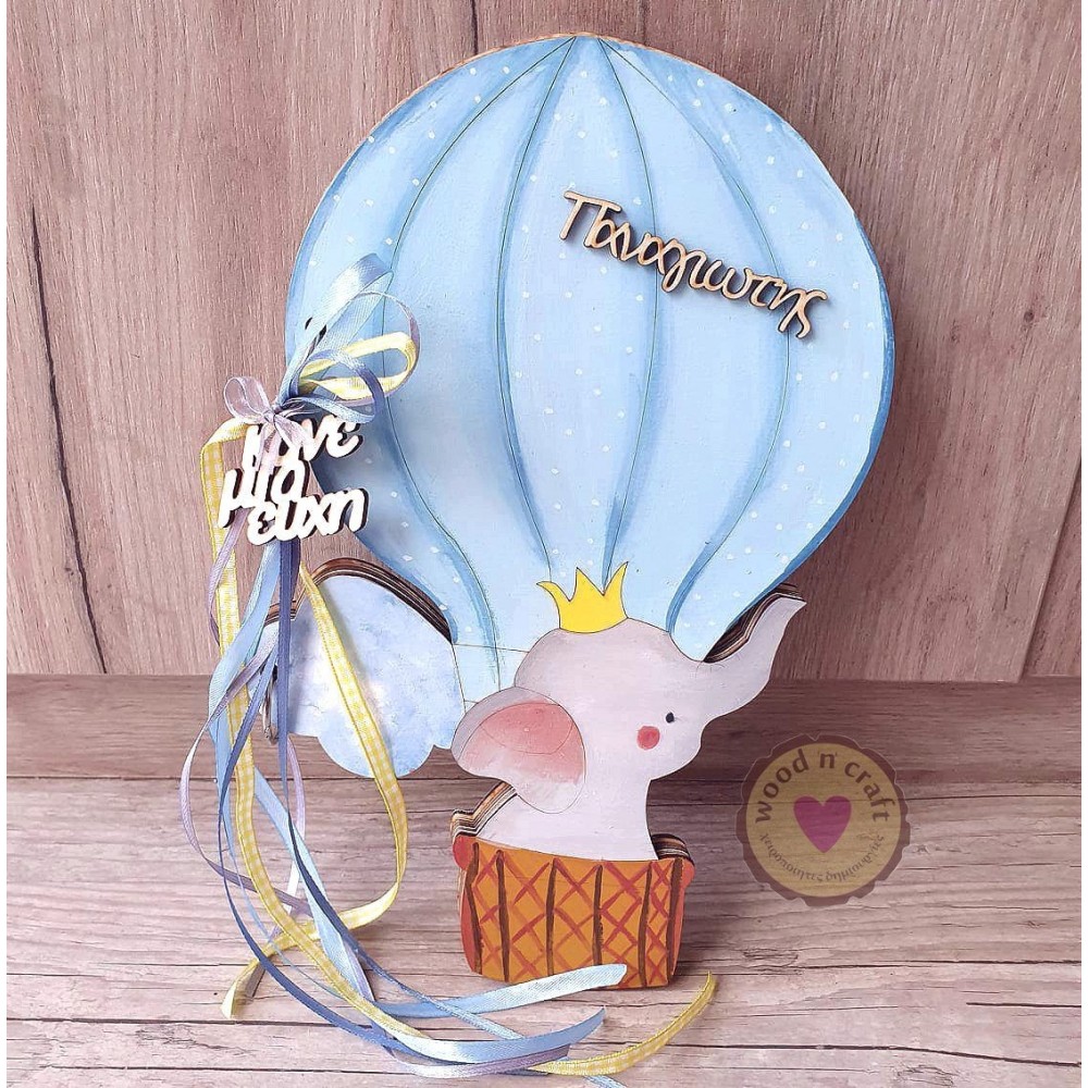 Ξύλινο χειροποίητο βιβλίο ευχών βάφτισης σε σχέδιο αερόστατο με ένα μικρό ελεφαντάκι με στέμμα. Κατασκευασμένο στα χρώματα της επιλογής σας με υψηλής ποιότητας εκτύπωση και διακοσμημένο με ανάλογα κορδελάκια και το όνομα της επιλογής σας!