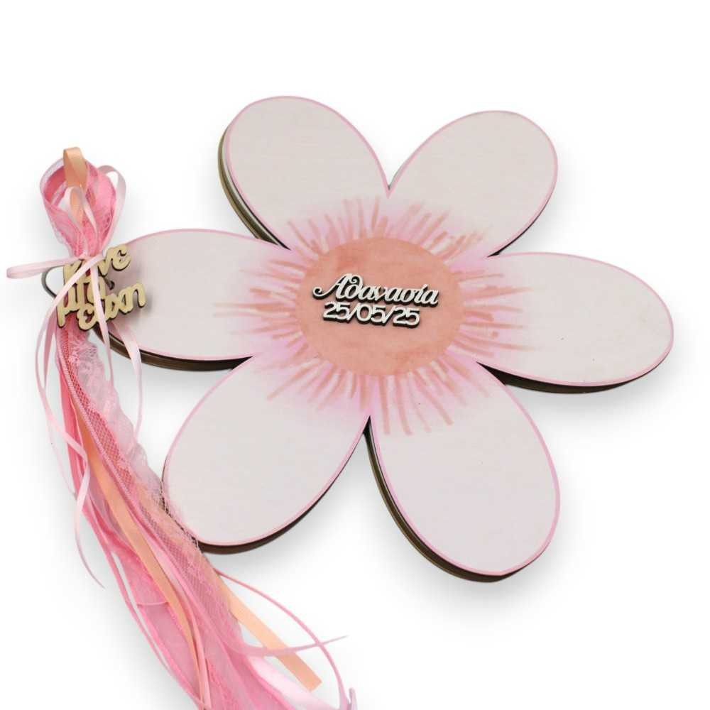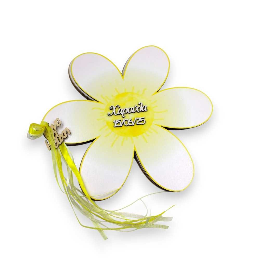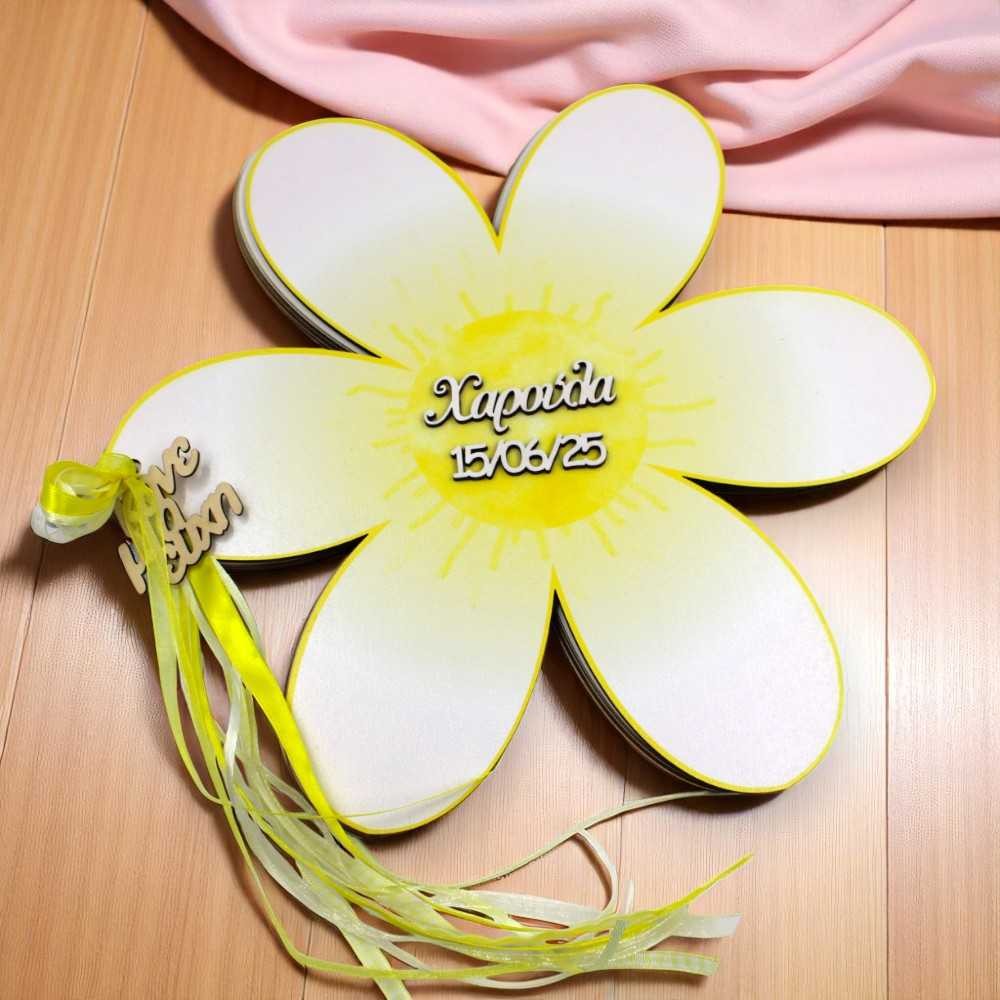 Χειροποίητο ξύλινο βιβλίο ευχών σε σχέδιο λουλούδι μαργαρίτα. Ένα πρωτότυπο ευχολόγιο στα χρώματα της επιλογής σας, διακοσμημένο με ανάλογες κορδέλες. Μοναδικό βιβλίο για να κρατήσετε της ευχές της βάφτισης ζωντανές!