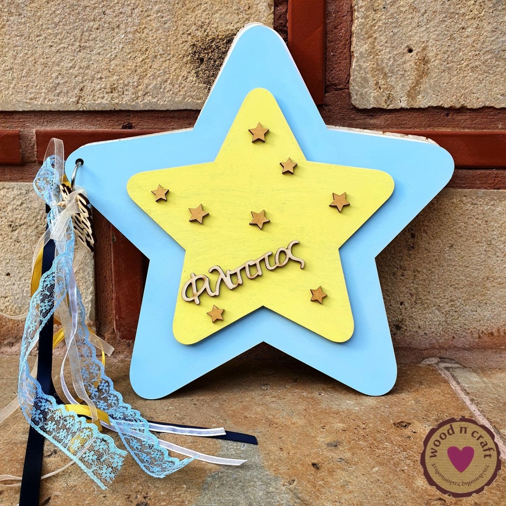 Ξύλινο χειροποίητο βιβλίο ευχών σε σχέδιο διπλό αστέρι. Ένα ξεχωριστό ευχολόγιο 3D με αντίθεση χρωμάτων της επιλογής σας, το όνομα του παιδιού και διάσπαρτα αστεράκια. Διακοσμημένο με κορδέλες ανάλογες με τα χρώματα της βάπτισης που ετοιμάζετε! Δυνατότητα επιλογής ονόματος.