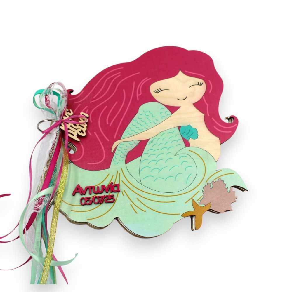 Πρωτότυπο ξύλινο χειροποίητο βιβλίο ευχών βάφτισης σε σχέδιο γοργόνα! Ένα ξεχωριστό σχέδιο προσαρμοσμένο στις αποχρώσεις που θα διαλέξετε και διακοσμημένο με κορδελάκια, δαντέλα, ξύλινο στοιχείο "κάνε μια ευχή" και προαιρετικά το όνομα και την ημερομηνία της επιλογής σας.