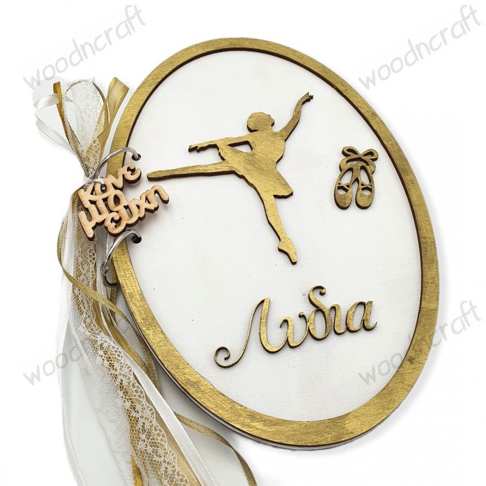 Χειροποίητο ξύλινο βιβλίο ευχών σε σχέδιο οβάλ κάδρο με περίγραμμα διακοσμημένο με παπουτσάκια πουέντ, μία μπαλαρίνα και φυσικά το όνομα της επιλογής σας! Αν ετοιμάζετε βάφτιση σε ανάλογο θέμα, είναι η ιδανική επιλογή.. Φτιάχνεται στις αποχρώσεις που θέλετε και διακοσμείται με ανάλογα κορδελάκια, ξύλινο στοιχείο "κάνε μια ευχή" και προαιρετικά με την ημερομηνία της επιλογής σας!