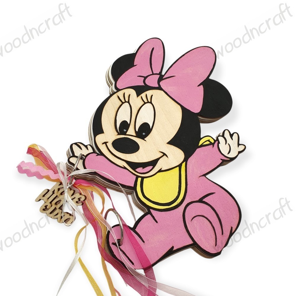 Χειροποίητο ξύλινο βιβλίο ευχών με την αγαπημένη ηρωίδα των παιδιών Μίνι Μάους μωρό. Μία όμορφη επιλογή διακόσμησης για μία βάφτιση ξεχωριστή. Το εξώφυλλο και τα κορδελάκια προσαρμόζονται στα χρώματα που ταιριάζουν με τον στολισμό που έχετε επιλέξει!