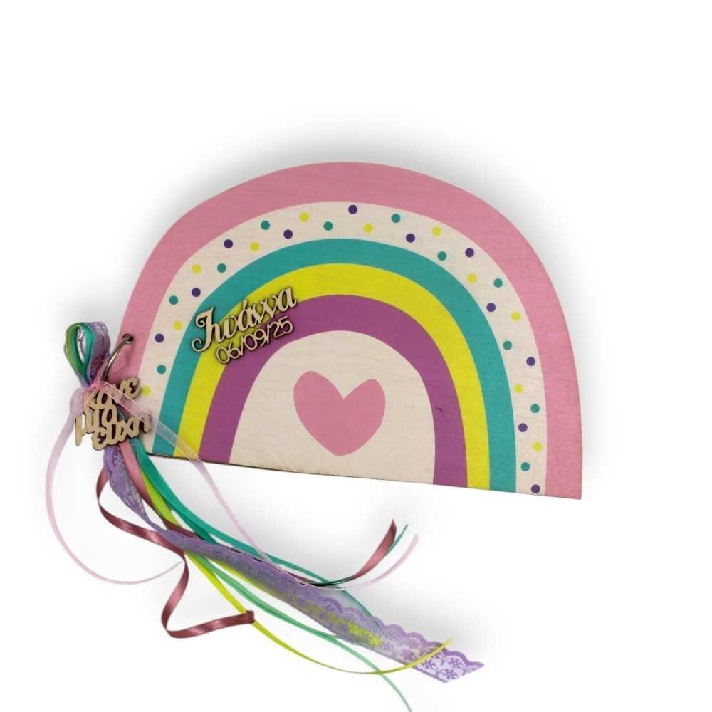 Ξύλινο χειροποίητο ευχολόγιο βάφτισης σε σχέδιο ουράνιο τόξο με καρδιά! Προσαρμόζεται στα χρώματα της επιλογής σας και διακοσμείται με ανάλογα κορδελάκια, δαντέλα, ξύλινο στοιχείο "κάνε μια ευχή" και προαιρετικά με το όνομα και την ημερομηνία της επιλογής σας!