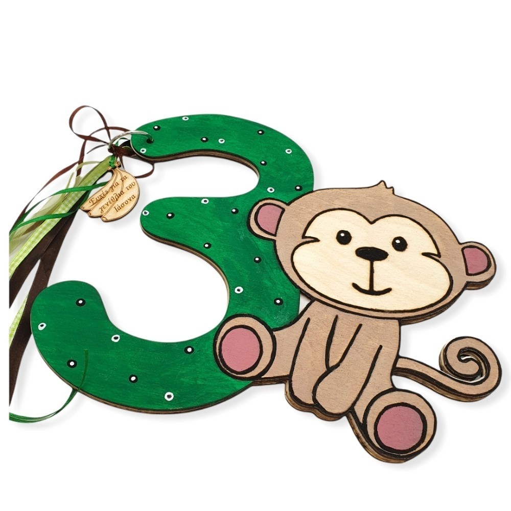 Χειροποίητο ξύλινο βιβλίο ευχών για παιδικά γενέθλια με ένα χαριτωμένο μαϊμουδάκι προσαρμοσμένο στον αριθμό της ηλικίας του παιδιού. Μπορεί να φτιαχτεί στα χρώματα που ταιριάζουν με τον στολισμό που έχετε επιλέξει, ενώ παράλληλα διακοσμείται με ανάλογα κορδελάκια και ξύλινο στοιχείο με χάραξη ευχές για το όνομα του παιδιού και προαιρετικά την ημερομηνία της επιλογής σας..