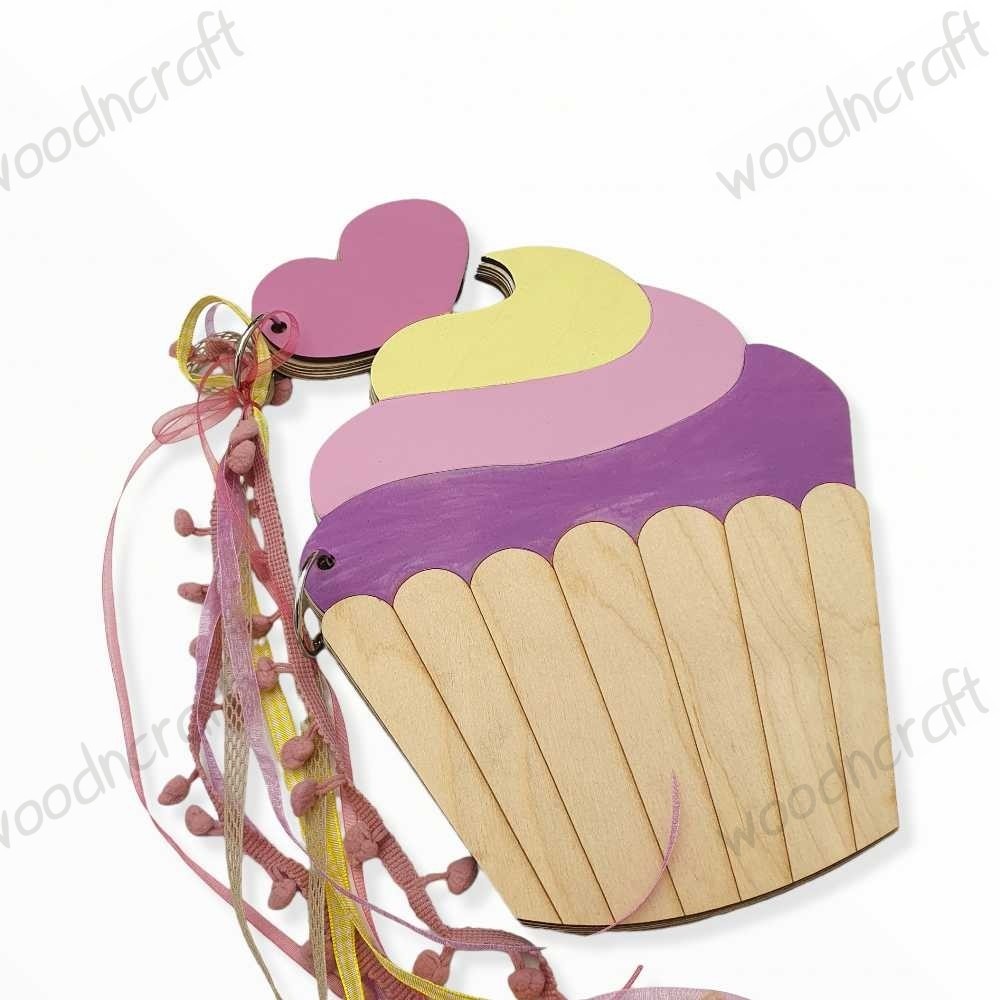 Ξύλινο χειροποίητο ευχολόγιο για στολισμό βάφτισης σε σχέδιο λαχταριστό Cupcake με μια καρδούλα στην κορυφή του! Για το εξώφυλλο του βιβλίου μπορείτε να επιλέξετε τα χρώματα που ταιριάζουν με τον στολισμό σας, καθώς και την διακόσμηση για τα κορδελάκια!