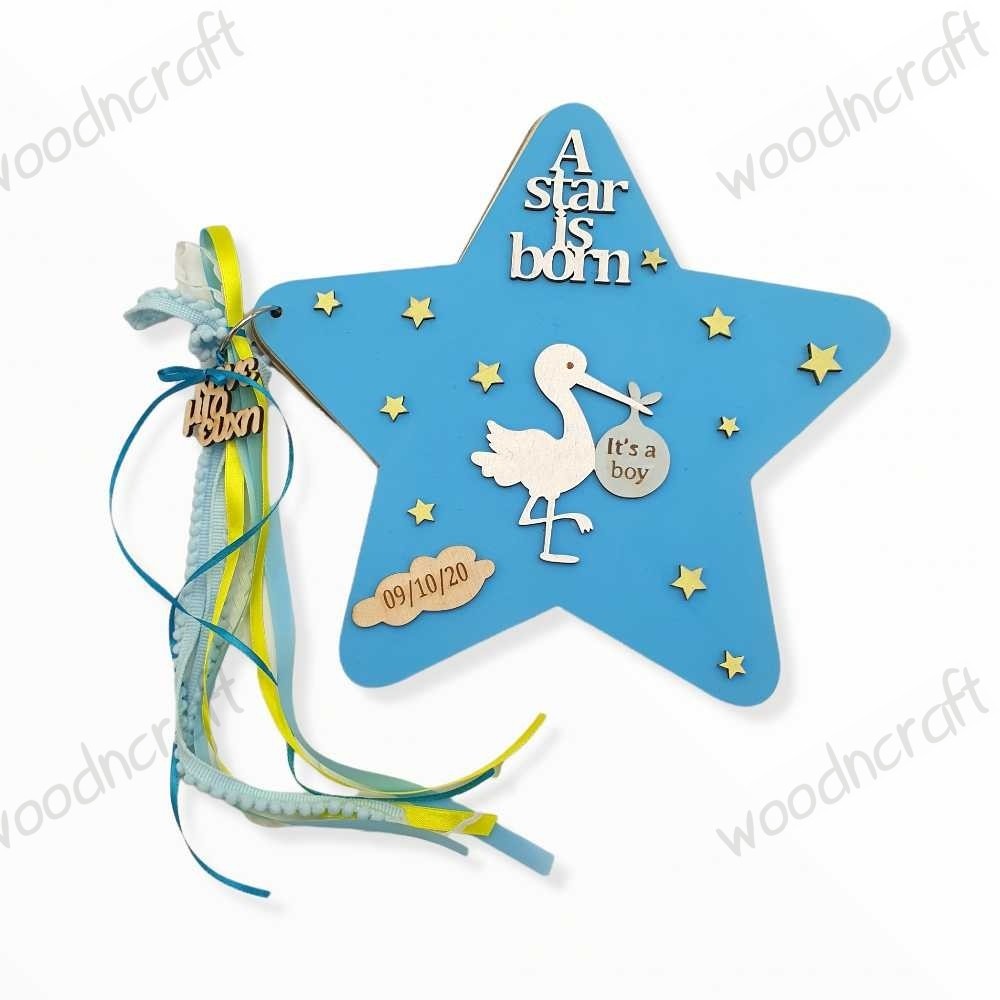 Ξύλινο χειροποίητο βιβλίο ευχών σε σχέδιο αστέρι με ένα πελαργό, συννεφάκι χαραγμένο με την ημερομηνία της επιλογής σας, διάσπαρτα μικρά αστεράκια και ξύλινη φράση "A star is born". Ένα μοναδικό ευχολόγιο στα χρώματα της επιλογής σας, διακοσμημένο με ανάλογες κορδέλες!