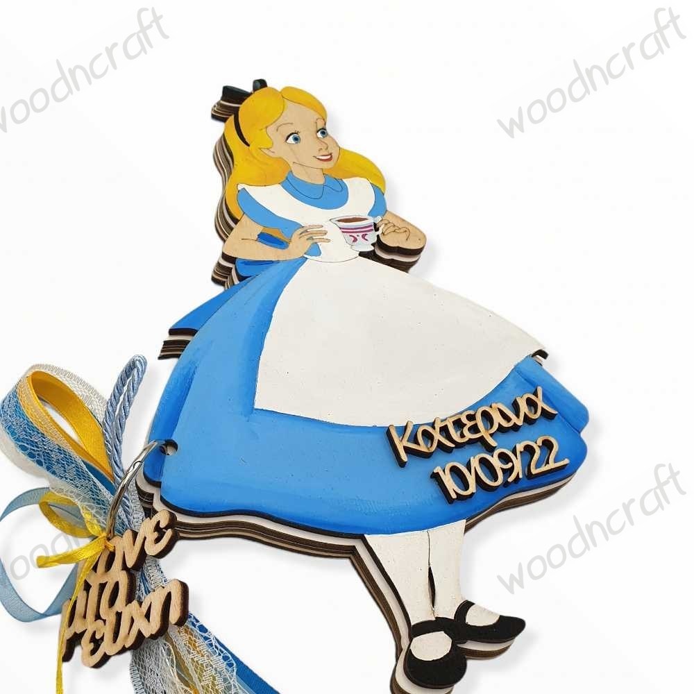Χειροποίητο ξύλινο βιβλίο ευχών σε σχέδιο Αλίκη με ένα φλιτζάνι στο χέρι! Αν ετοιμάζετε στολισμό βάφτισης σε θέμα Alice in wonderland τότε αυτή είναι η ιδανική επιλογή.. Διαλέγετε τα χρώματα που προτιμάτε για το ευχολόγιο και τα κορδελάκια της διακόσμησης και προαιρετικά σημειώνετε το όνομα του παιδιού καθώς και την ημερομηνία της βάφτισης, ή των γενεθλίων του!