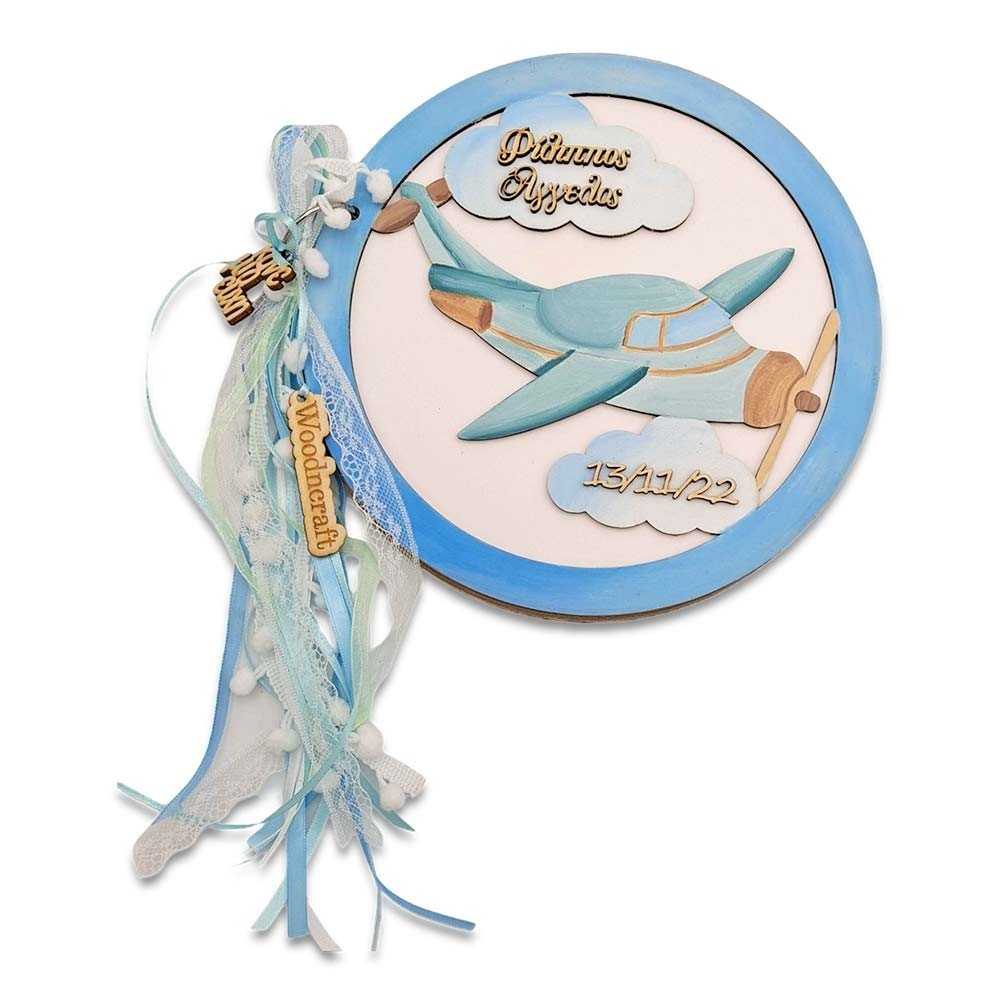 Ξύλινο ευχολόγιο για στολισμό βάφτισης ή παιδικού πάρτι γενεθλίων σε σχέδιο αεροπλάνο προσαρμοσμένο μέσα σε στεφάνι και ένα συννεφάκι με το όνομα του παιδιού και την ημερομηνία της σημαντικής σας περίστασης! Κατασκευάζεται στα χρώματα της επιλογής σας και διακοσμείται με ανάλογα κορδελάκια!