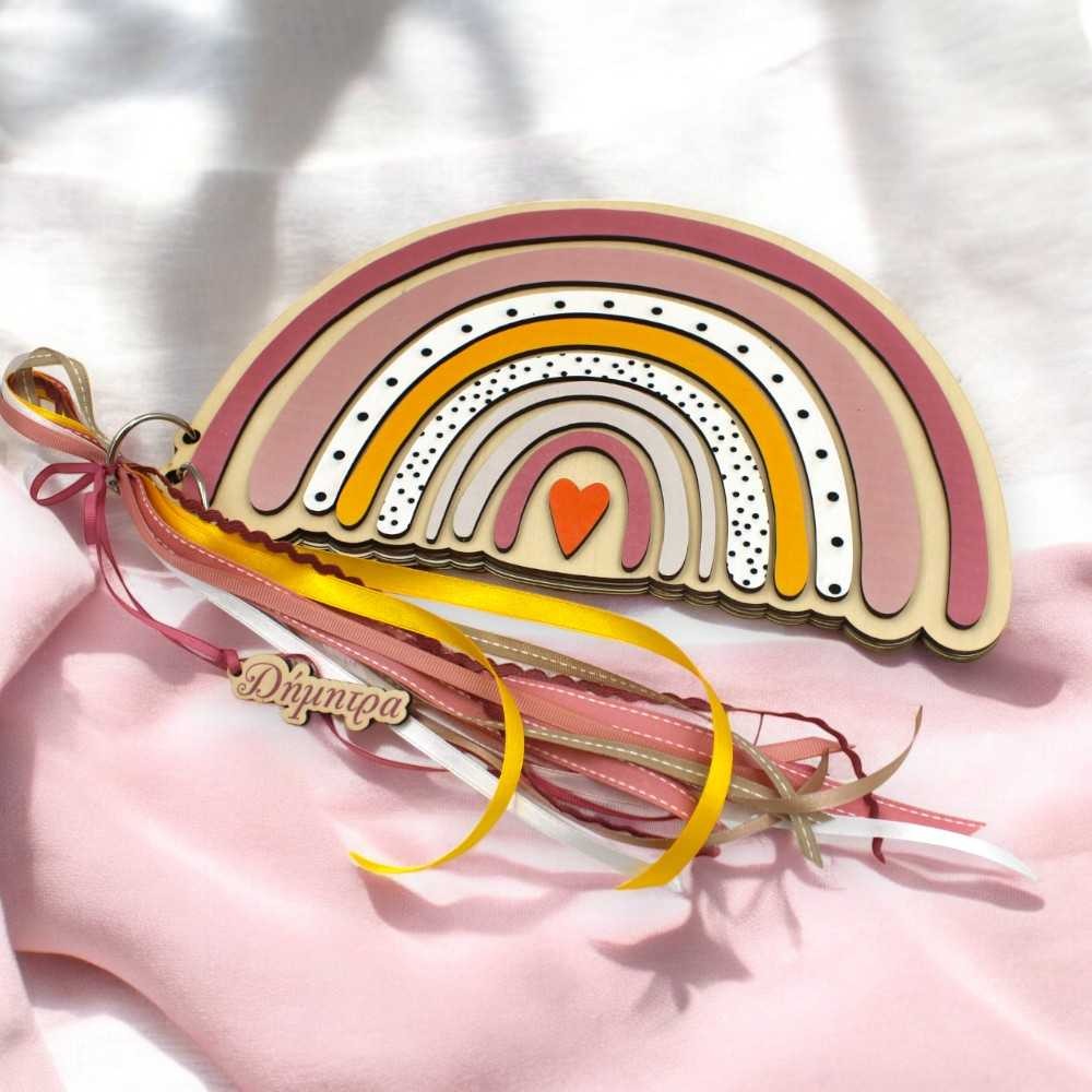 Σχεδιασμένο με θέμα το ουράνιο τόξο, το βιβλίο διαθέτει δύο στρώσεις ξύλου και έχει μέγεθος 30 cm. Οι καμπύλες του ουράνιου τόξου γίνονται σε αποχρώσεις της επιλογής σας και είναι διακοσμημένες με κουκίδες , δημιουργώντας ένα εντυπωσιακό αποτέλεσμα.