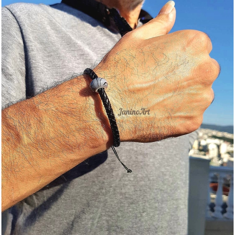 Χειροποίητο ανδρικό βραχιόλι πλεξούδα από συνθετικό δέρμα, διακοσμημένο με χάντρα γκρι με μαύρα νερά, μεταλλικές άκρες και δέσιμο μακραμέ που αυξομειώνεται.