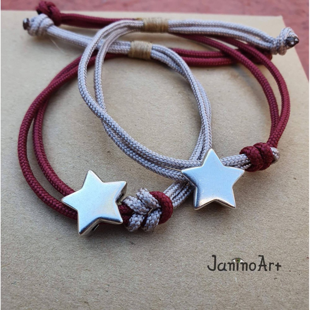 Πρωτότυπα χειροποίητα βραχιολάκια με μπορντό και μπεζ κορδόνι, διακοσμημένα με μεταλλικά αστεράκια και κούμπωμα που αυξομειώνεται! Φορέστε ένα ξεχωριστό χειροποίητο κόσμημα από τη συλλογή μας JaninoArt!