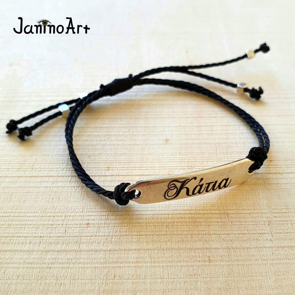 Μοναδικό χειροποίητο βραχιολάκι με μεταλλική ταυτότητα από χυτό ζάμακ χαραγμένη με το όνομα της επιλογής σας, περασμένη σε μαύρο σχοινάκι με δέσιμο μακραμέ που αυξομειώνεται και διακοσμημένο με μικρούς μεταλλικούς κύβους!