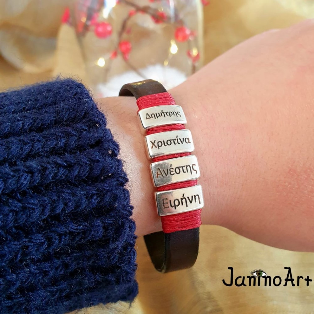 Μοναδικό χειροποίητο δερμάτινο βραχιόλι, διακοσμημένο με κόκκινο νήμα και μεταλλικά στοιχεία χαραγμένα με τα ονόματα της επιλογής σας. Εξαιρετική επιλογή για να χαρίσετε στυλ και δύναμη στον εαυτό σας φορώντας ένα κόσμημα με τα αγαπημένα σας πρόσωπα!