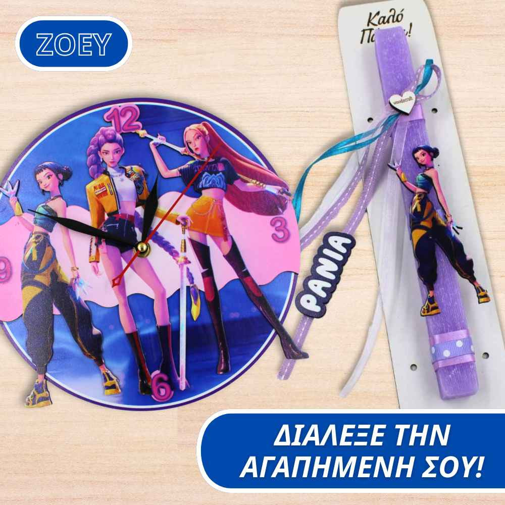 Το σετ συμπληρώνεται με ένα εντυπωσιακό ξύλινο ρολόι τοίχου με θέμα Kpop Demon Hunters – Huntrix, το οποίο αποτελεί μια όμορφη διακοσμητική πινελιά για το παιδικό δωμάτιο και ένα αναμνηστικό που θα μείνει και μετά το Πάσχα.