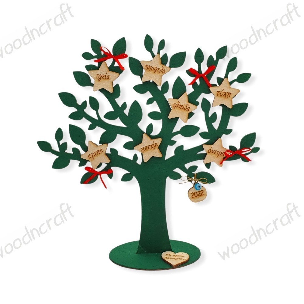 Ξύλινο επιτραπέζιο διακοσμητικό δέντρο με ευχές χαραγμένες σε αστεράκια. Μία διαφορετική επιλογή για να ευχηθείτε τα καλύτερα στα αγαπημένα σας πρόσωπα! Ιδανικό για την διακόσμηση του σπιτιού ή της επιχείρησης σας, για δώρο Χριστουγέννων και Πρωτοχρονιάς, για δωράκι σε φίλους και συγγενείς ή για δωράκι στους πελάτες σας!