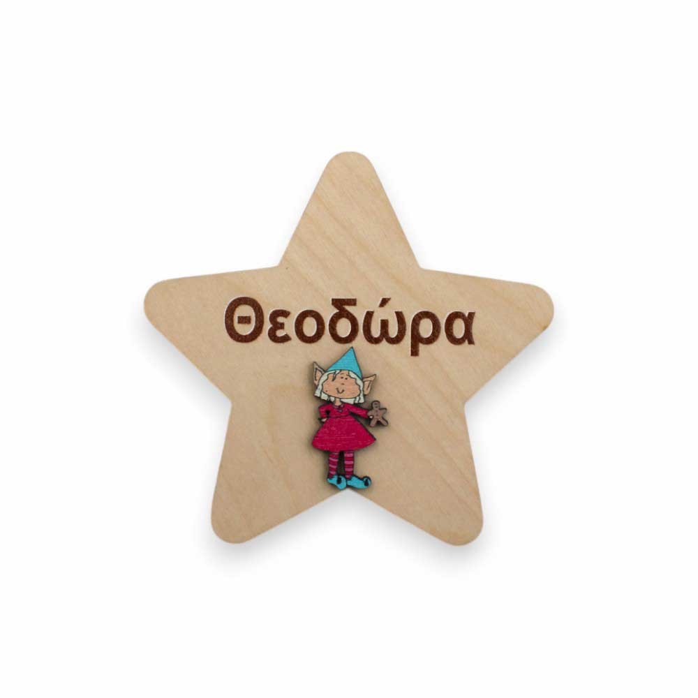 Πρωτότυπο ξύλινο μαγνητάκι σε σχέδιο αστέρι με ένα κοριτσάκι ξωτικό και χάραξη ονόματος της επιλογής σας!
