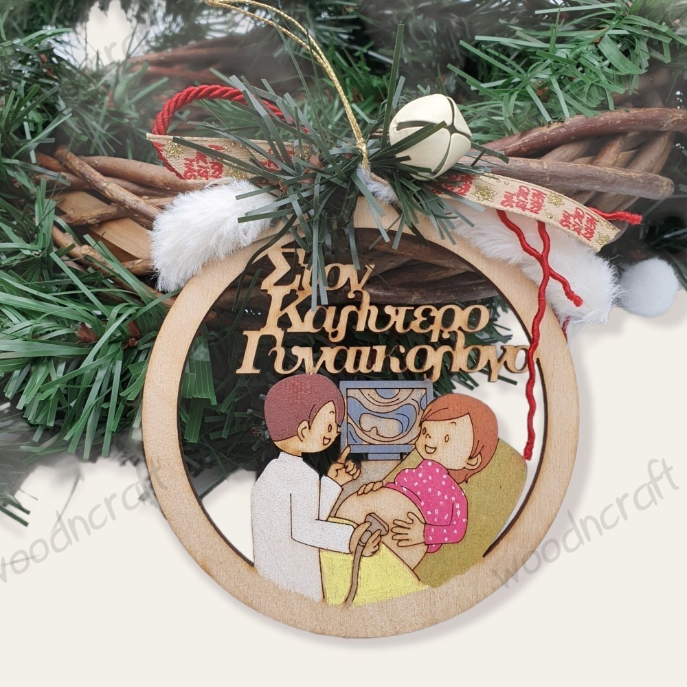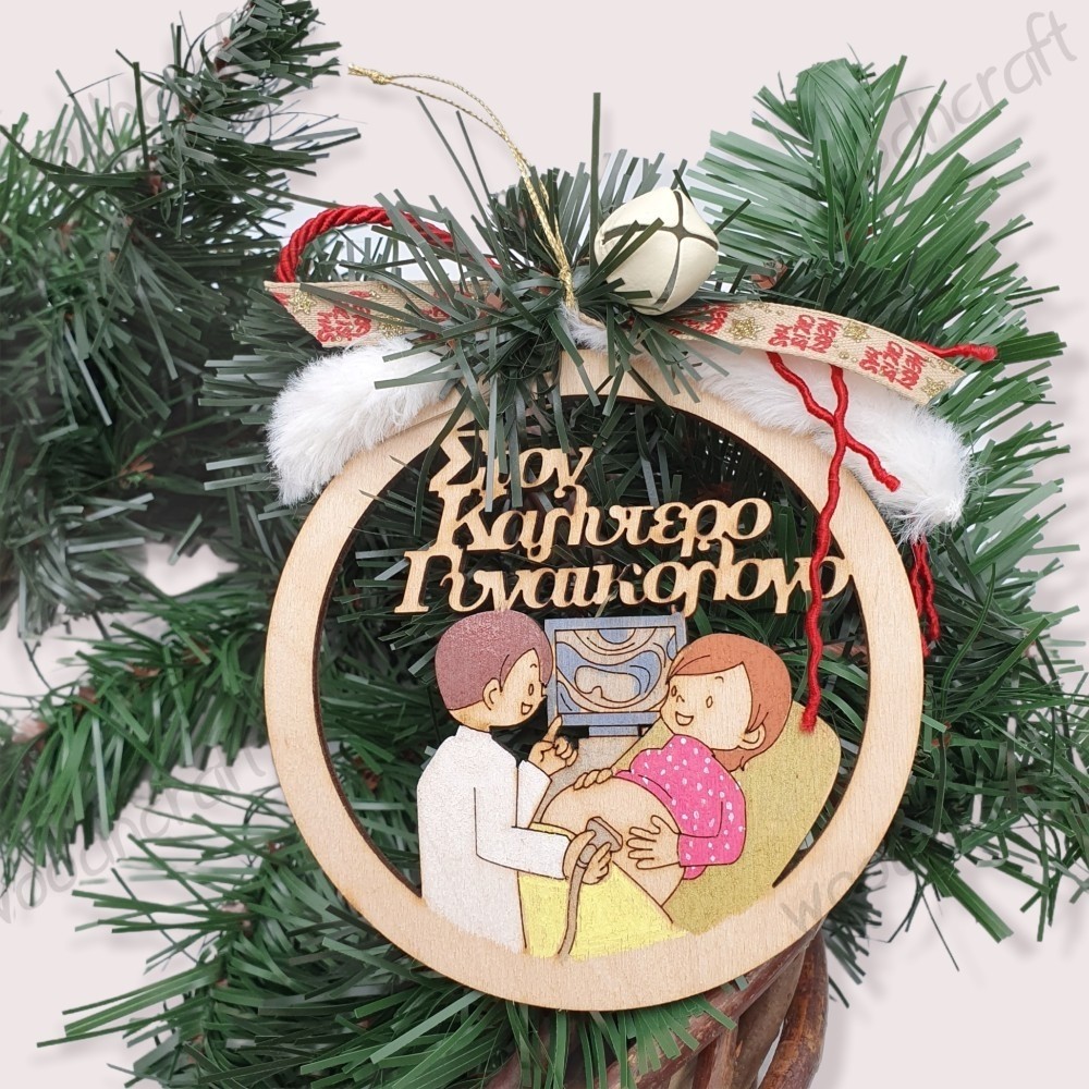 Ξύλινο χειροποίητο χριστουγεννιάτικο στολίδι σε σχήμα μπάλας με προσαρμοσμένη αναπαράσταση και αφιέρωση για τον καλύτερο γυναικολόγο! Διακοσμημένο με κορδόνι, κορδέλα, χριστουγεννιάτικο κλαδάκι και γιορτινό κουδουνάκι!