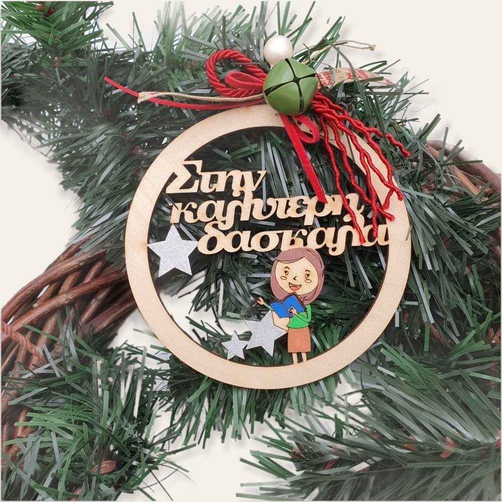 Ξύλινο χειροποίητο χριστουγεννιάτικο στολίδι σε σχήμα μπάλας με προσαρμοσμένη αναπαράσταση και αφιέρωση για την καλύτερη δασκάλα! Διακοσμημένο με κορδόνι, κορδέλα με ευχές δαντέλα και γιορτινό κουδουνάκι!
