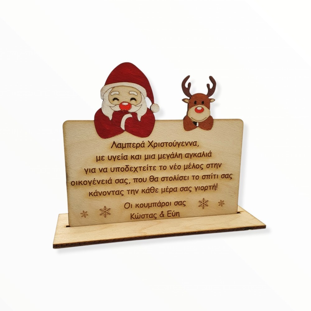 Πρωτότυπο ξύλινο χειροποίητο σταντάκι χαραγμένο με Χριστουγεννιάτικες ευχές για τα αγαπημένα σας πρόσωπα υπό την επίβλεψη του Άγιου Βασίλη και του τάρανδού του!