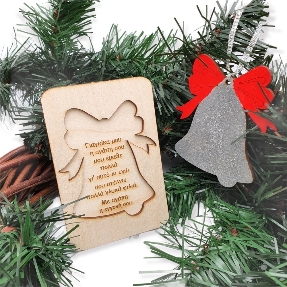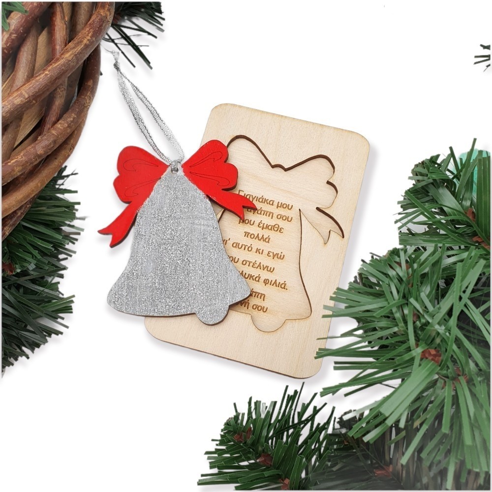Ξύλινη χειροποίητη παζλ - κάρτα με αφιέρωση και χριστουγεννιάτικο στολίδι καμπάνα! Βάφεται σε χρώμα της επιλογής σας.