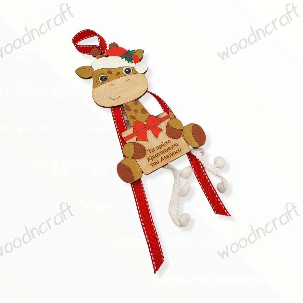 Ξύλινο χειροποίητο παιδικό γούρι σε σχέδιο μωρό καμηλοπάρδαλη με γιορτινό σκούφο και ένα δώρο στην αγκαλιά με χάραξη για τα πρώτα Χριστούγεννα του μωρού! Διακοσμημένο με κορδελάκια.