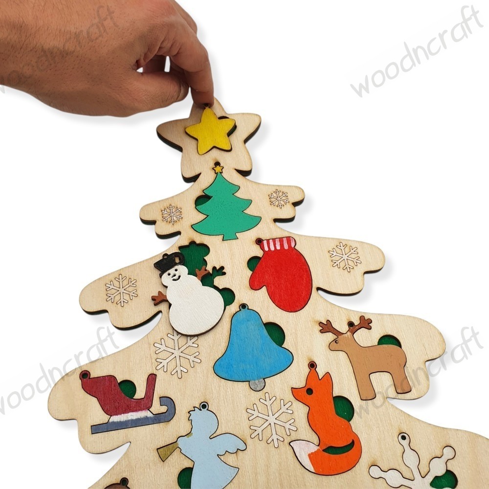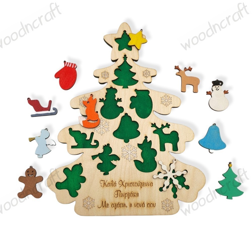 Μοναδικό ξύλινο χειροποίητο εκπαιδευτικό παζλ σε σχήμα έλατο με χριστουγεννιάτικα στολίδια, χαραγμένο με την αφιέρωση της επιλογής σας. Το παιδάκι μπορεί να παίξει με τα στολίδια, να διακοσμήσει το δωμάτιο του ή το χριστουγεννιάτικο δέντρο και μετά να κάνει ξανά το παζλ όσες φορές θέλει!