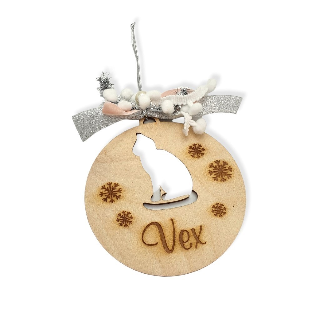 Ξύλινο χειροποίητο στολίδι σε σχέδιο χριστουγεννιάτικης μπάλας με διάτρητη γατούλα, χαραγμένες χιονονιφάδες και φυσικά το όνομα της επιλογής σας! Ένα ξεχωριστό διακοσμητικό στολίδι για το αγαπημένο σας κατοικίδιο διακοσμημένο με χριστουγεννιάτικα κορδελάκια και πέρλα.