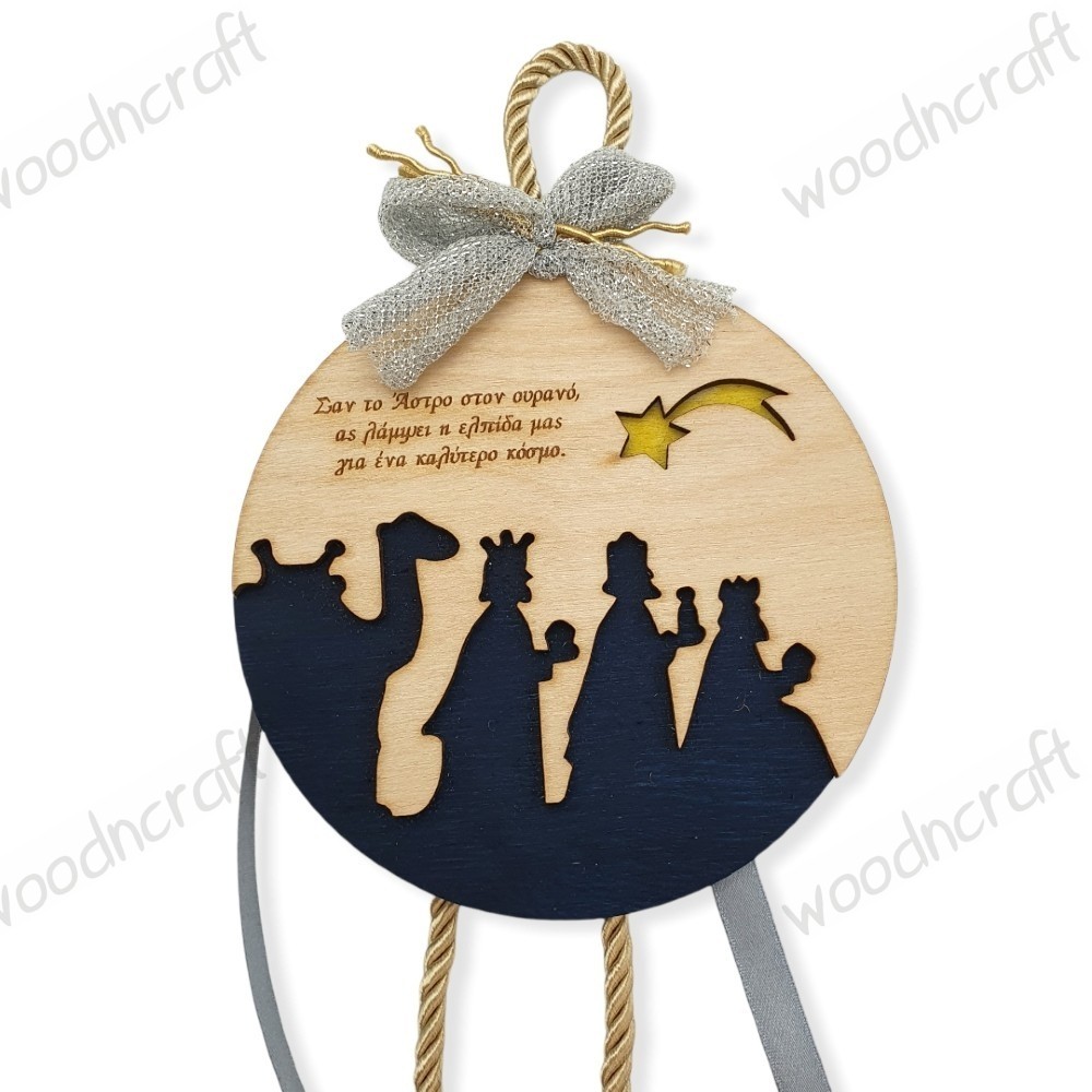 Πρωτότυπο ξύλινο χειροποίητο γούρι υψηλής αισθητικής, με δύο επιφάνειες ξύλου που τις ενώνουμε και δημιουργείται μια αναπαράσταση με τους τρεις μάγους και το άστρο που τους καθοδηγεί! Η κάτω επιφάνεια είναι βαμμένη στο χέρι, ενώ ή πάνω είναι χαραγμένη με μία ξεχωριστή αφιέρωση! Διακοσμημένο με κορδόνι, κορδελάκι και φιογκάκι.